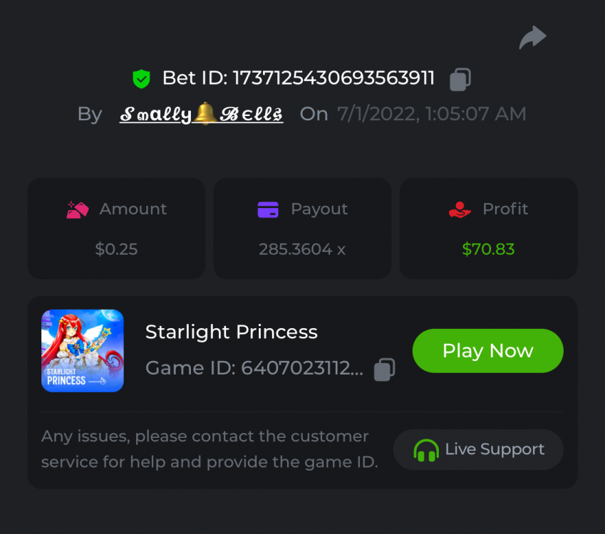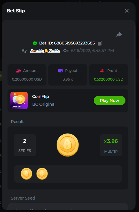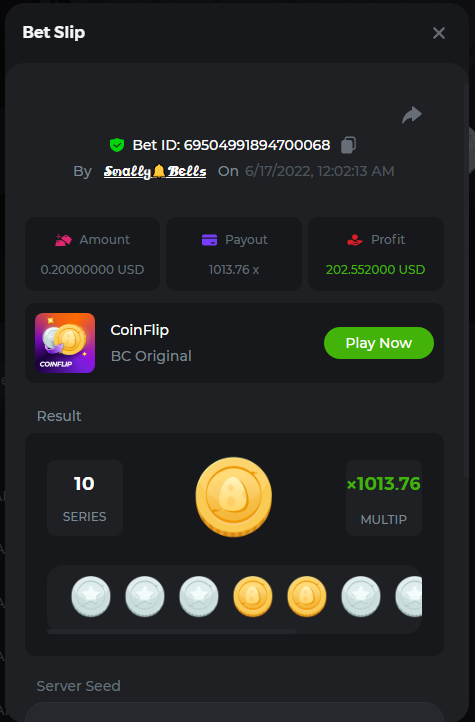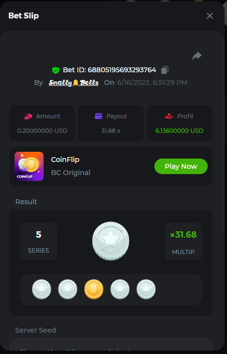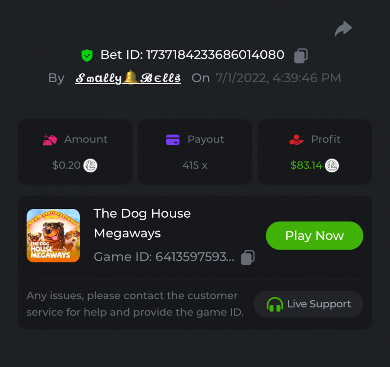 1. Sweet Bonanza: 196.44x https://hash.game/sd/?sd=10O1L1AME2AO0J Gates of Olympus: 360x https://hash.game/sd/?sd=10NXINXXM5HPUB Big Bass Bonanza: 272.5x https://hash.game/sd/?sd=10NXGKI8MBUBYR Wild West Gold Megaways: 209.12x https://hash.game/sd/?sd=10NSHRFA3IZXG3 Bigger Bass Bonanza: 636.5x https://hash.game/sd/?sd=10O4IBZ1B94M4Z Sweet Bonanza Xmas: 423x https://hash.game/sd/?sd=10NSIW1H25RBBN Starlight Princess: 285.36x https://hash.game/sd/?sd=10NSBCSCJUJAJ7 Dog House Megaways: 415x https://hash.game/sd/?sd=10NTX8PH8UUHHV It doesn't matter for anything but just FYI in case it's reused - the prize pool table pic says "4rd place" lol Bounty: 50x (idk why its .0001x - LTC fluctuations maybe...was a $5.00 win on a $0.10 bet though) https://hash.game/sd/?sd=10NXOMAF8XVF2R
