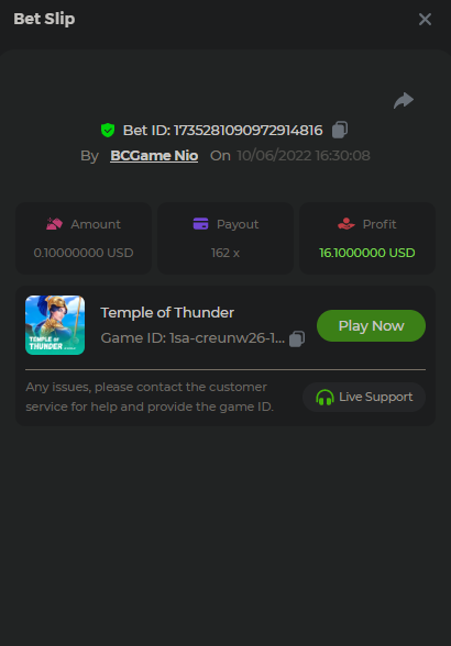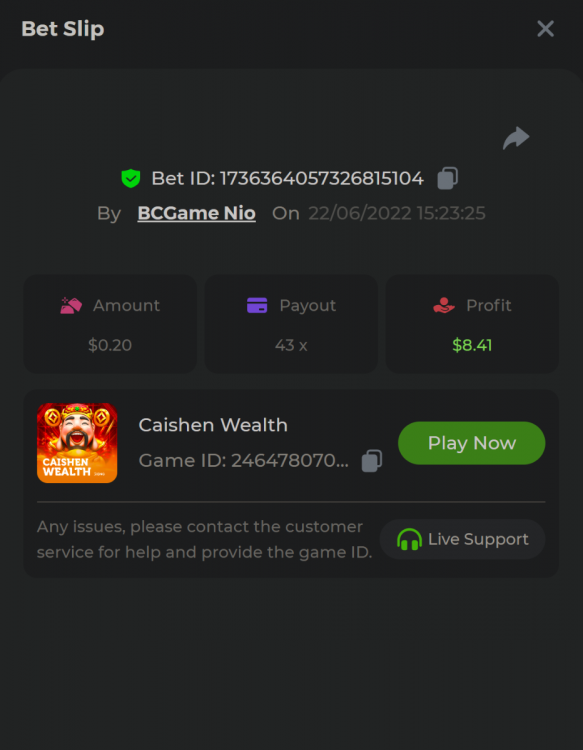 Hello, VIPs! Welcome back for this week's battle, we're hosting another BGaming event with a prize pool of up to $4,000! Participants need to hit the highest multipliers on five selected slots and payouts will be added together to rank. In order to spice up the event, anyone who completes the bonus will receive 10% of the prize equally. Keep your fingers crossed! (details further below). Eligible Games Win the highest multiplier on the BGaming slots listed below Joker Queen Bonanza Billion Wild Cash BC Million BC Bonanza The highest multiplier reached in each game will be added together and counted as total points. Bonus buys are allowed. If the player submits multiple winning entries for the same game, the entry with the highest multiplier will be valid. Minimum VIP Tier Must be VIP04 or higher in order to enter this event. Minimum Payout Minimum payout to qualify is 10x (in any game) for a valid entry. Minimum Bet Size Joker Queen - $0.08 Bonanza Billion - $0.20 Wild Cash - $0.10 BC Million - $0.20 BC Bonanza - $0.20 Eligible Coins All cryptocurrencies are eligible (excepting JB, and BCL). Free Play Mode is not valid for this event. Prize Pool & Reward Breakdown The winners will win a share of the prize pool based on the detailed ranking below. Anyone who completes the side bounty will receive a share of a 10% of the prize pool. BOUNTY - Join the Bounty of 51x! Share a bet that shows exactly 51x payout on any of the five games within the timeframe of this Battle and you will receive a share of 10% of the prize pool! If nobody wins exactly the payout, the player/s closest to the payout will win this bounty! Original rules apply with a minimum bet, minimum payout & VIP. How to Enter Access the game to select your Bet ID, click on the Share icon (↷) and then Copy link. Return to the topic, paste the link in the field "Reply to this topic..." E.g.: https://bc.game/sd/?sd=10MQ30W32Z6W43 Each eligible entry must have the Bet Slip URL, the non-inclusion of the link will disqualify participation in the event. In the same post, upload a screenshot of your win by clicking the game ID WITH VIEW IN USD mode ENABLED (accessible at the bottom of dropdown menu for your wallet up top, and Submit Reply. Done! This way, we can ensure that your bet indeed met the minimum requirement at the time of placing it: Example post - Link: https://bc.game/sd/?sd=10MQ30W32Z6W43 Good luck everyone!