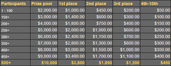 A special thanks to all players who participated in this Challenge. We had a total of 41 valid participants! Here is the winners list. Ranking 1st $1.000 - bassabar 2nd$500 - KG562 3rd$300 - LoskiY 2000x BOUNTY - Equal share of $200 - bassabar - KG562 - Elpresidente Check out our ongoing Challenges and those already made here.