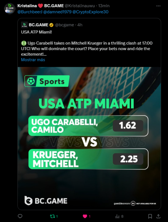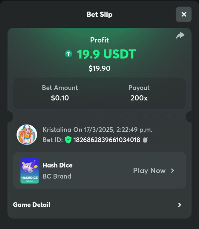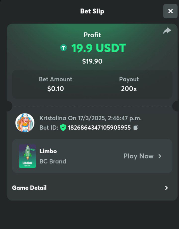 2. Easy 1. Deposit Txid: 4434113e293eb472a7b171d17fbe54cbfb34631824705869716f789ec0040181 2. Instagram: @LincesaMdq 3. Instagram Post: https://www.instagram.com/p/DHXgr4JspCP/?igsh=ZWgwenpqYXVreTF 4. Twitter: @Kristalinauwu 5. Like, retweet & tag: @Kristalinauwu https://x.com/Kristalinauwu/status/1901728054969274750 6. Follow BCGame Facebook: Gisela Gall 7. Limbo: https://bc.co/game-detail/1825513481832927011 8. Sports bet: Ticket ID: 2513820866270339253 9. Arabian Secret: https://bc.co/game-detail/1825439374915515681 10. Sugar Fiesta 1000: https://bc.co/game-detail/1825441146495751971 11. 2FA activated: Medium 1. Deposit TxID: 4d707ead402ff5771e270374a5fc42f5798fdc6bd13d6bf975996a5316cb53ff TxID: 39d9776a52287c2bdc8bea45c1a751ae618ef4976ed8907766ce39ac0603937f 2. Crash: https://bc.co/game-detail/1825546630112045702 3. Plinko: https://bc.co/game-detail/1825430753182757665 4. Roulette: https://bc.co/game-detail/1825527742035924514 5. Starshine Princess 1000: https://bc.co/game-detail/1825598330617384993 6. Stellar Rush: https://bc.co/game-detail/1825601183186807841 7. Keno: https://bc.co/game-detail/1825612623614982433 8: Poker Ways: https://bc.co/game-detail/1825547398747784483 9. Wukong: https://bc.co/game-detail/1825595350268898850 10. Lottery and Porsche tickets: 11. Sports bet Combo Ticket ID: 2512055034057994476 Hard 1. Wheel: https://bc.co/game-detail/1825529693239491107 2. Crash: https://bc.co/game-detail/1825774085023770502 3. CoinFlip: https://bc.online/game-detail/1825620056214876707 4. Stellar Rush: https://bc.co/game-detail/1826242186137422626 5. Plinko: https://bc.co/game-detail/1825459660201698850 6. Limbo: https://bc.online/game-detail/1826864347105905955 7. Hashdice: https://bc.online/game-detail/1826862839661034018 8. Sea of Olympus 1000: https://bc.co/game-detail/1825539068560977186 9. Gold of Olympus: https://bc.online/game-detail/1826344599486243619 10. Duck Hunter: https://bc.co/game-detail/1825605420251285539 11. Sports bet combo Ticket ID: 2513187573116055908