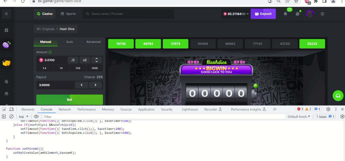 1. Hash Dice Script with Switching High/ Low and different strategies based on Martingale Bankroll - 82 TRX Target 10% profit in one run - 10 TRX Start Base amount - 0.01 TRX. Payout Multiplier - 3 After each win, bet amount will be reset. strategy will be changed After each loss, bet amount will be doubled and switch high/low will be done based on strategy rule. Strategy 1 : high,high,high,high,high,high,high,high,high,high,high,high,high Strategy 2 : low,high,low,high,low,high,low,high,low,high,low,high,low Strategy 3 : low,low,low,low,low,low,low,low,low,low,low,low,low Strategy 4 : high,low,high,low,high,low,high,low,high,low,high,low,high Strategy 5 : high,low,low,high,high,low,high,low,low,high,high,low,high Strategy 6 : high,low,high,high,low,low,high,low,high,high,low,low,high **** There is no guarantee that you will win always. **** disclaimer - Don't consider this as regular earning system. In casino, house always win, sooner or later you will loose your money. Script might fail based on browser hang / page reload / network issue, in that case you might loose your money. DM for the demo video and script.