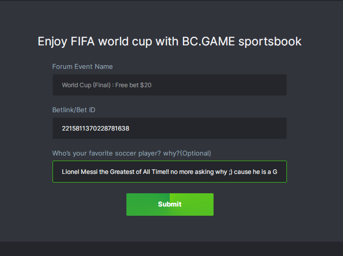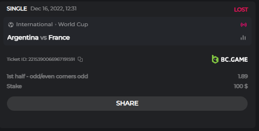 11. Ticket ID: 2215390066967191591 should had bet on the Argentina XD sucks one game only and dead. anyway thank you for the wonderful promotion Bc.game