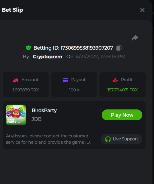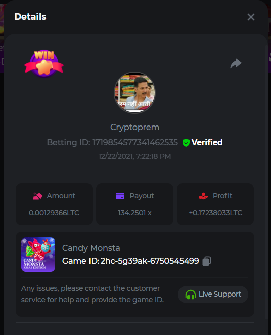 13. Betting ID: 1719831209635249024 Aloha king elvis 102.80x Betting ID: 1719854577341462535 Candy Monsta 134.25x