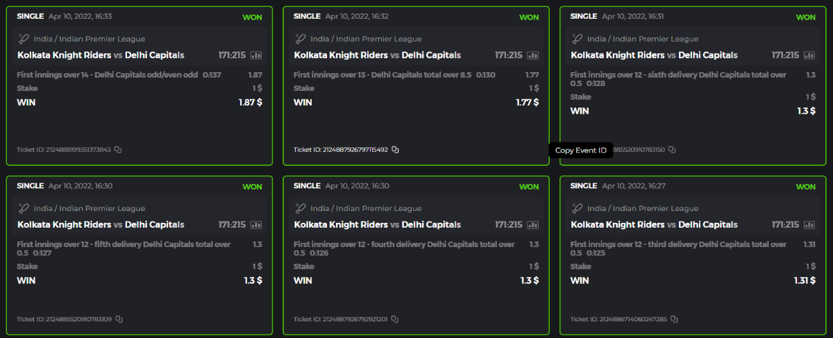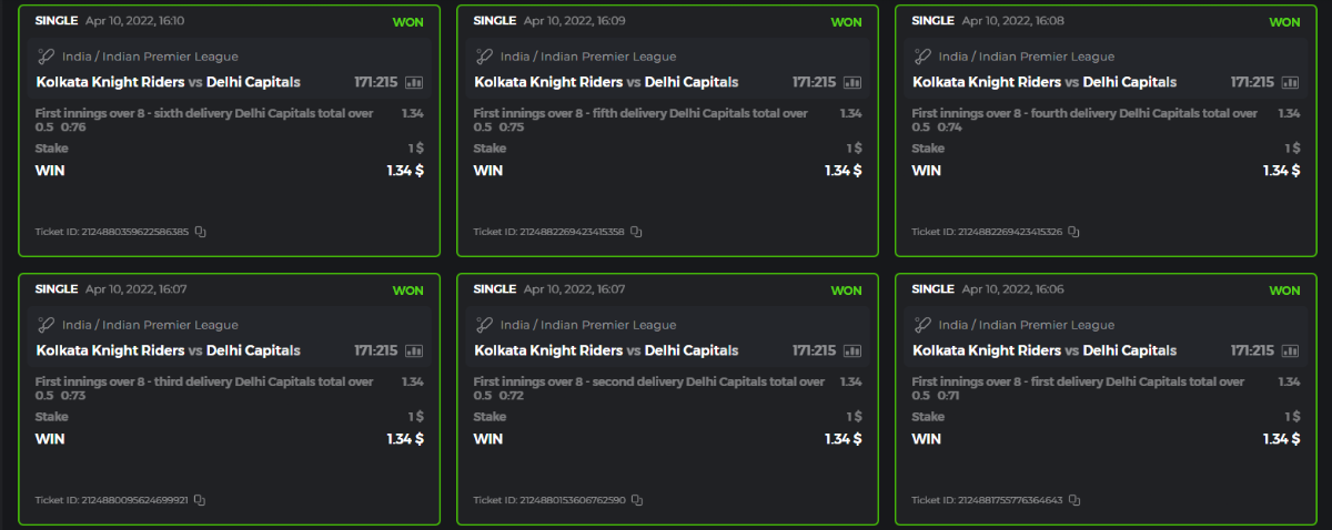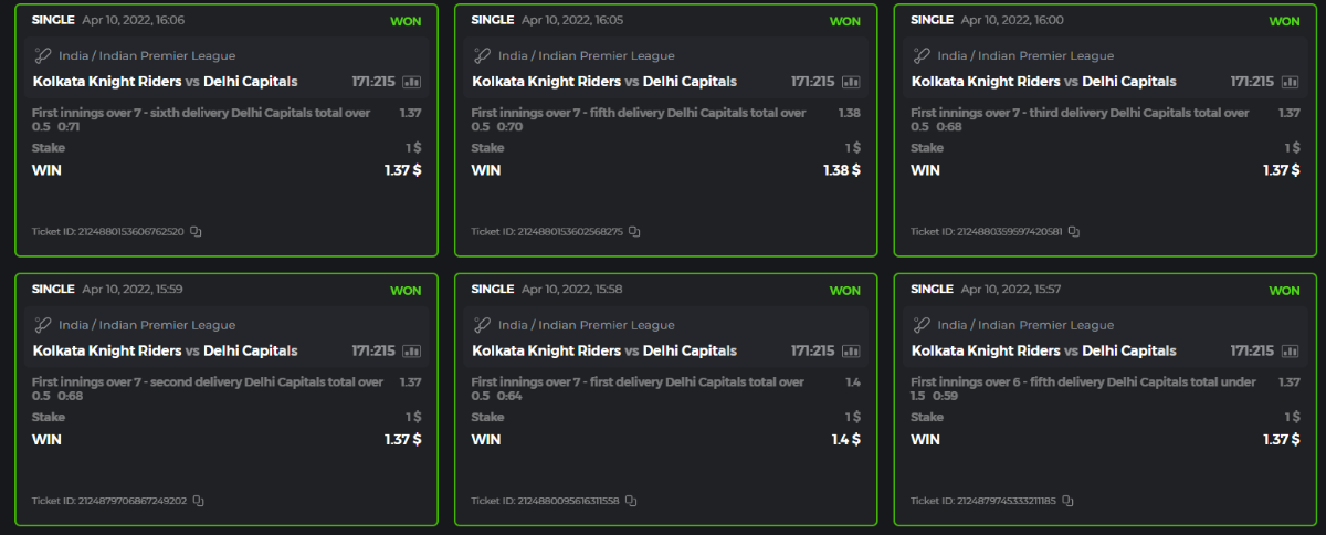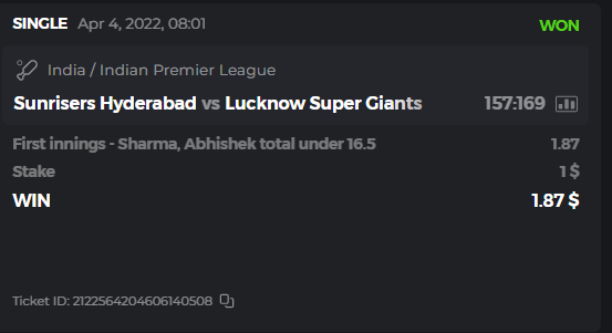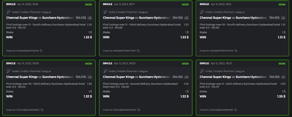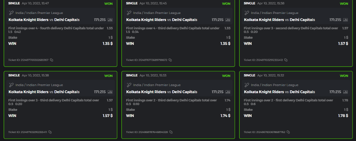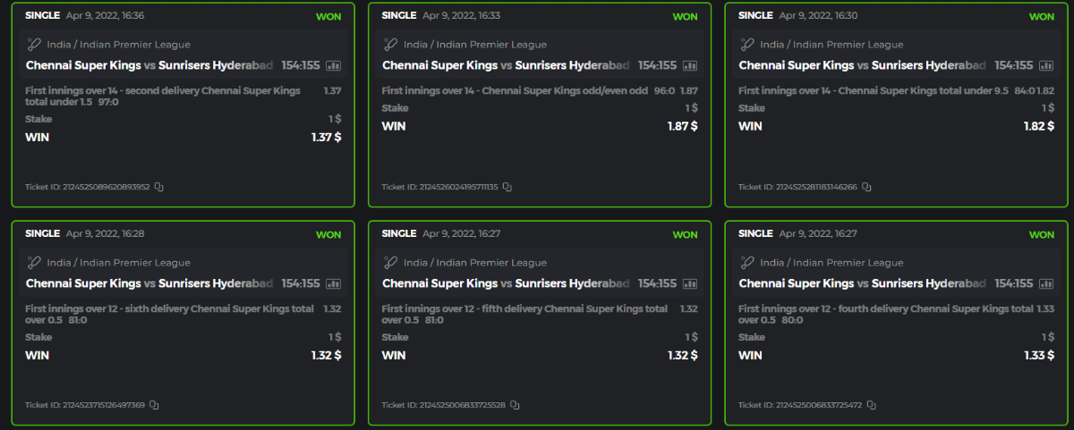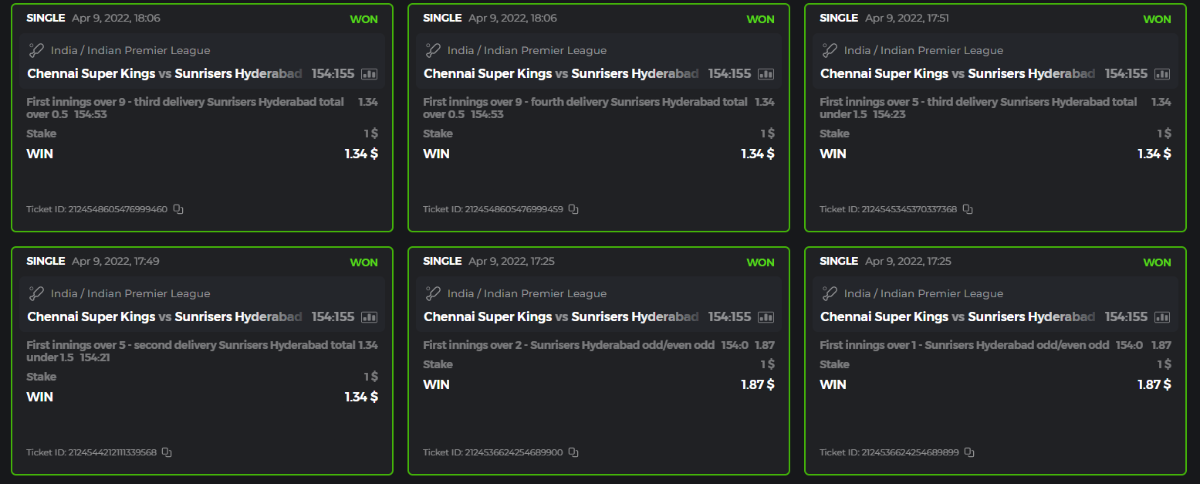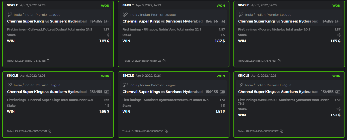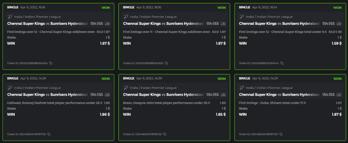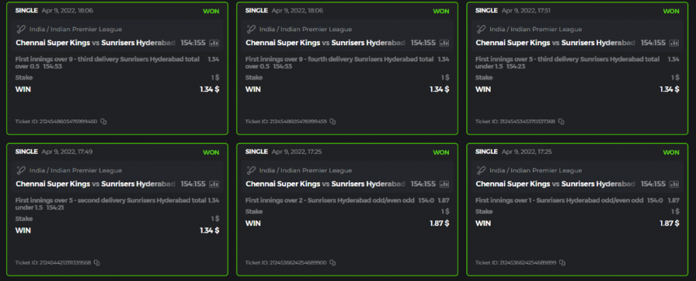 10. Well played bro but i Think your parlay combo bets are invalid because the Minimum odds pr match is 1.3 so you placed bet in combo of 4 than total odds must be atleast 2.8561 but total odds of your parlay combo bets showing 1.78 it means you have selected market lower then 1.3 in combo bet. please upload full screen shot like this of your combo bets so other competitors can see odds and can see that you have placed bets in IPl only in combo bet.. Thanks