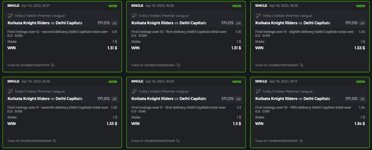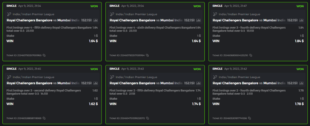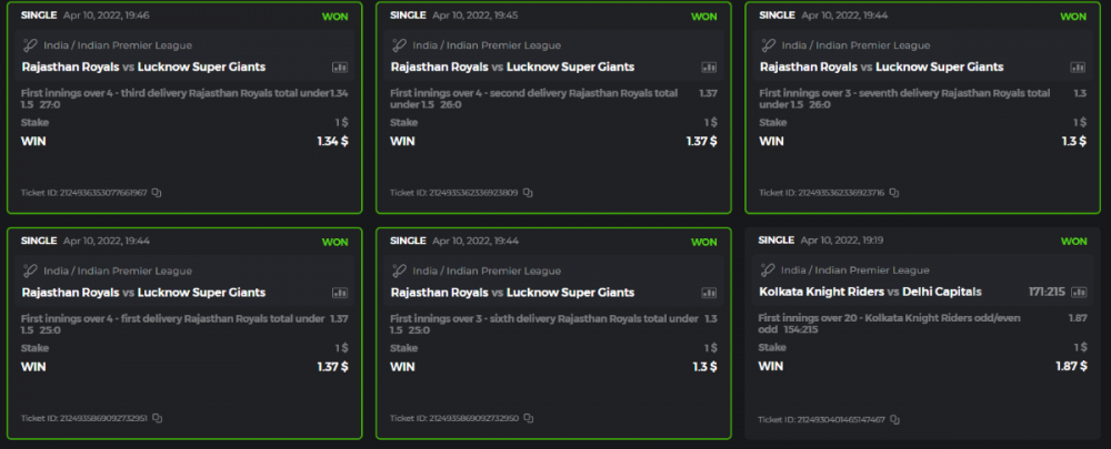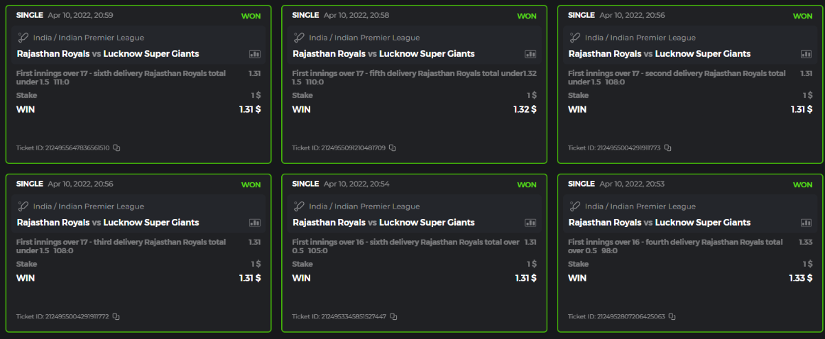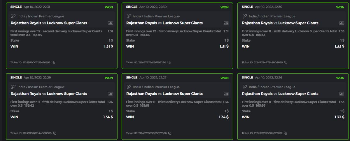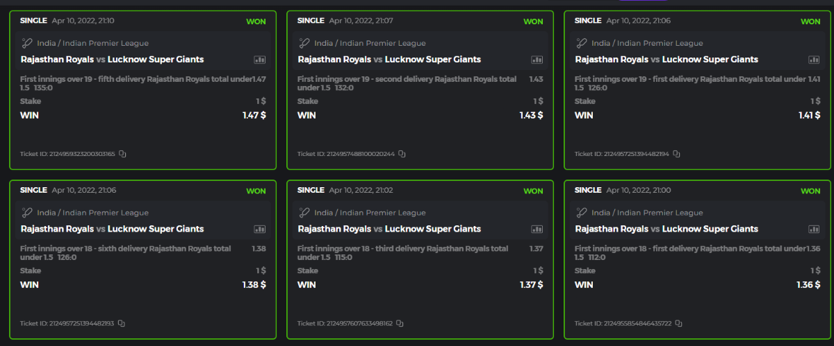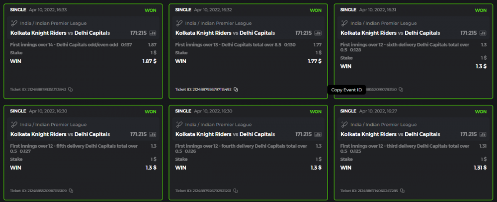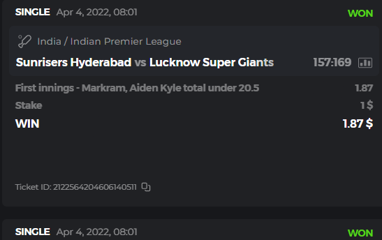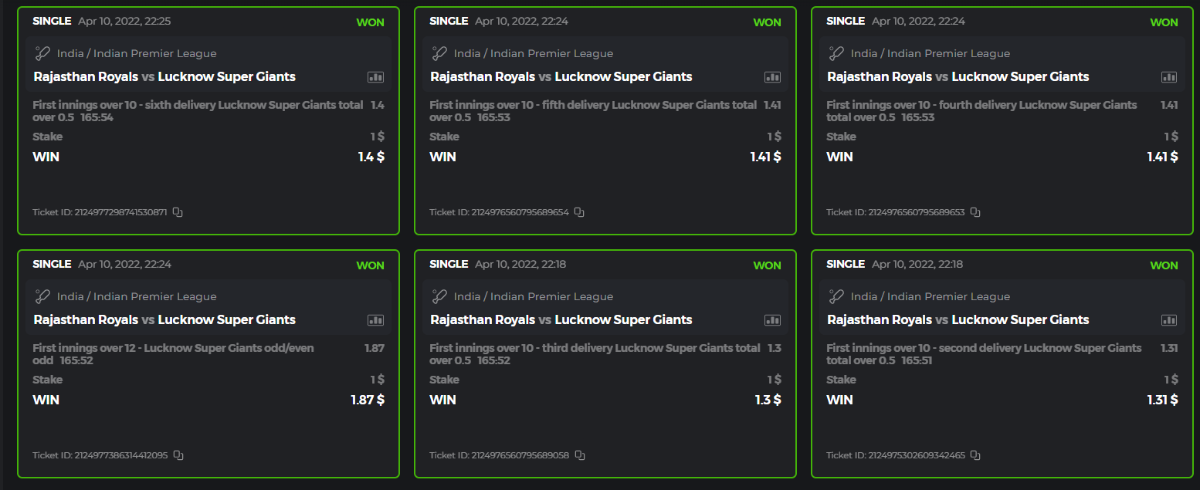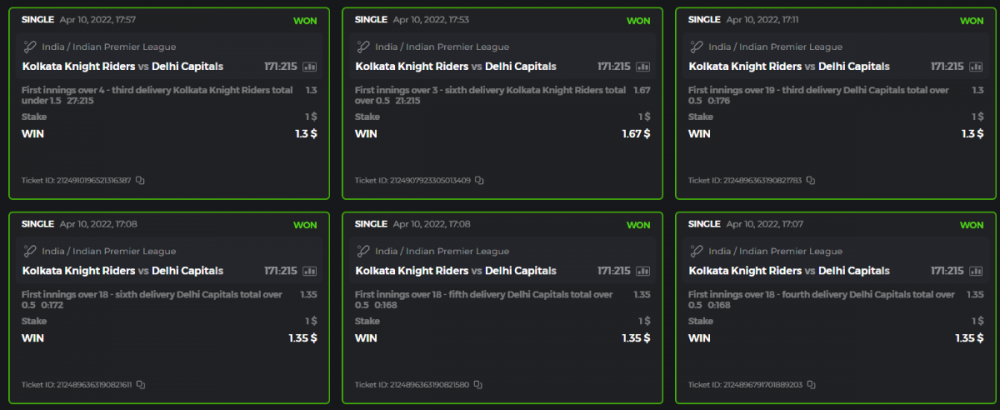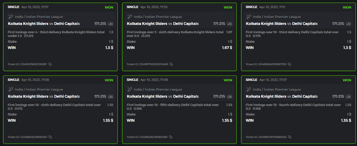 10. Well played bro but i Think your parlay combo bets are invalid because the Minimum odds pr match is 1.3 so you placed bet in combo of 4 than total odds must be atleast 2.8561 but total odds of your parlay combo bets showing 1.78 it means you have selected market lower then 1.3 in combo bet. please upload full screen shot like this of your combo bets so other competitors can see odds and can see that you have placed bets in IPl only in combo bet.. Thanks