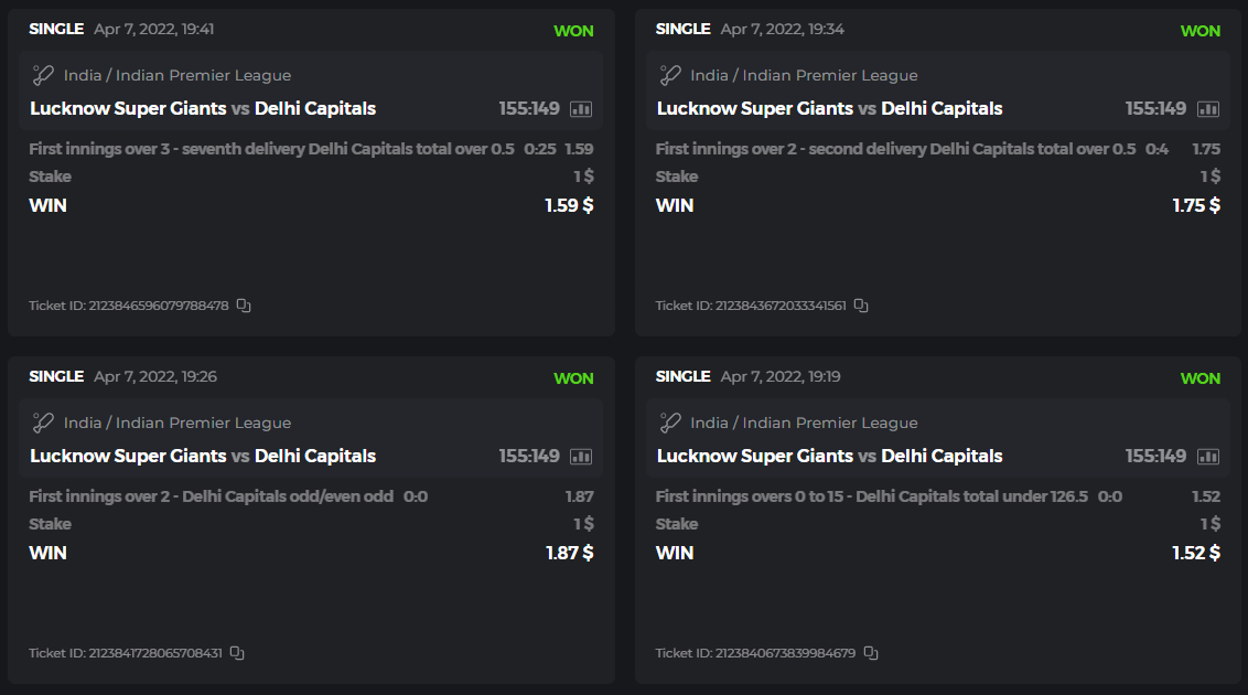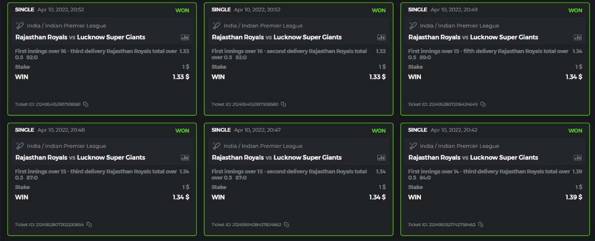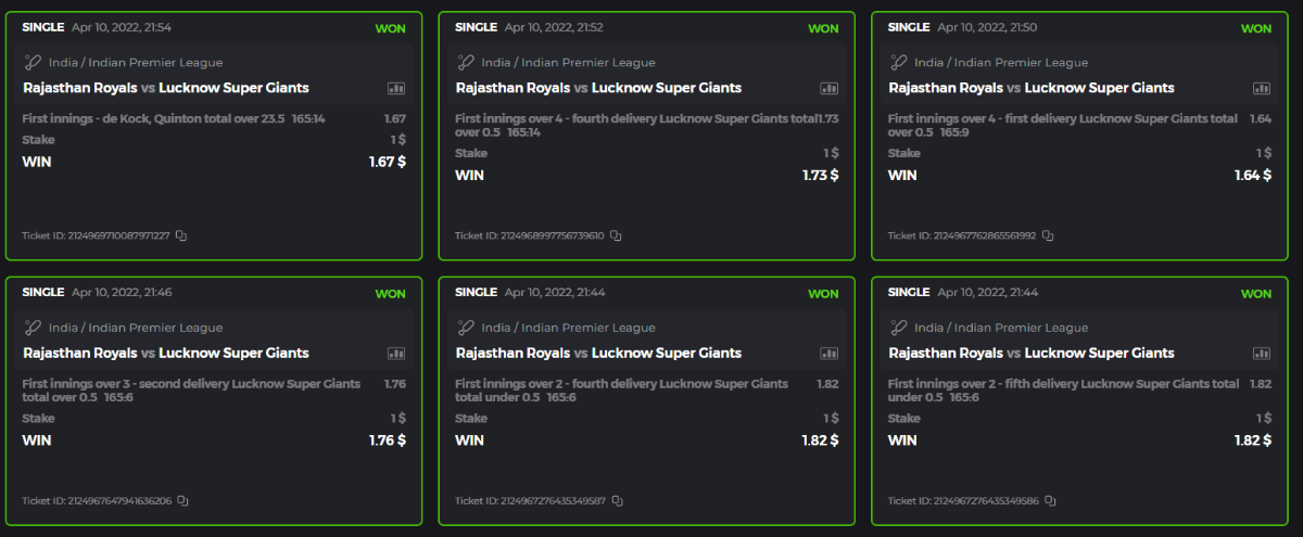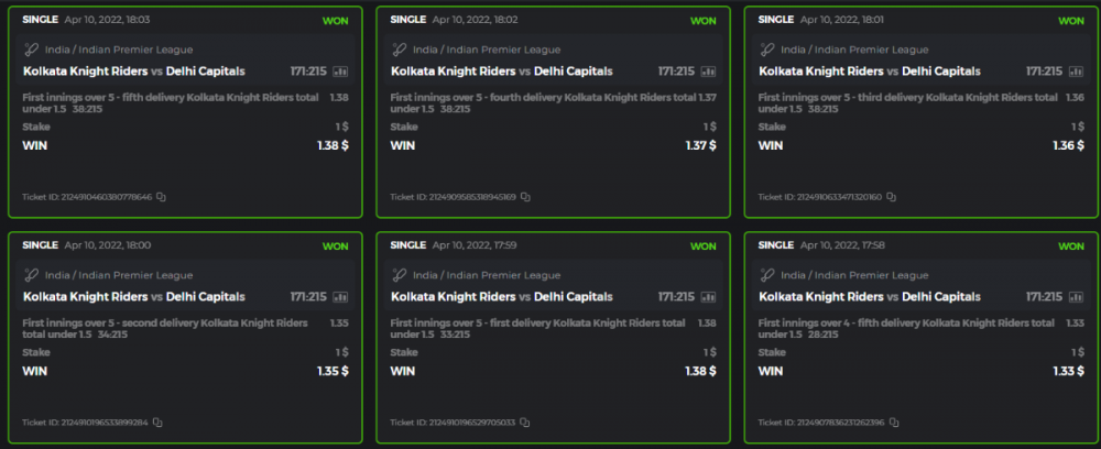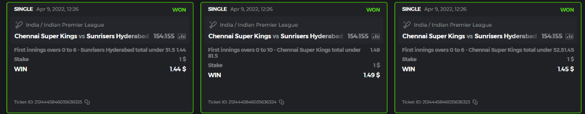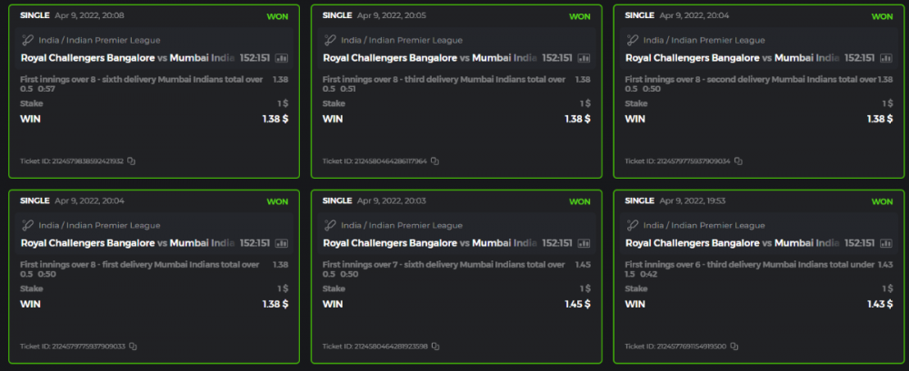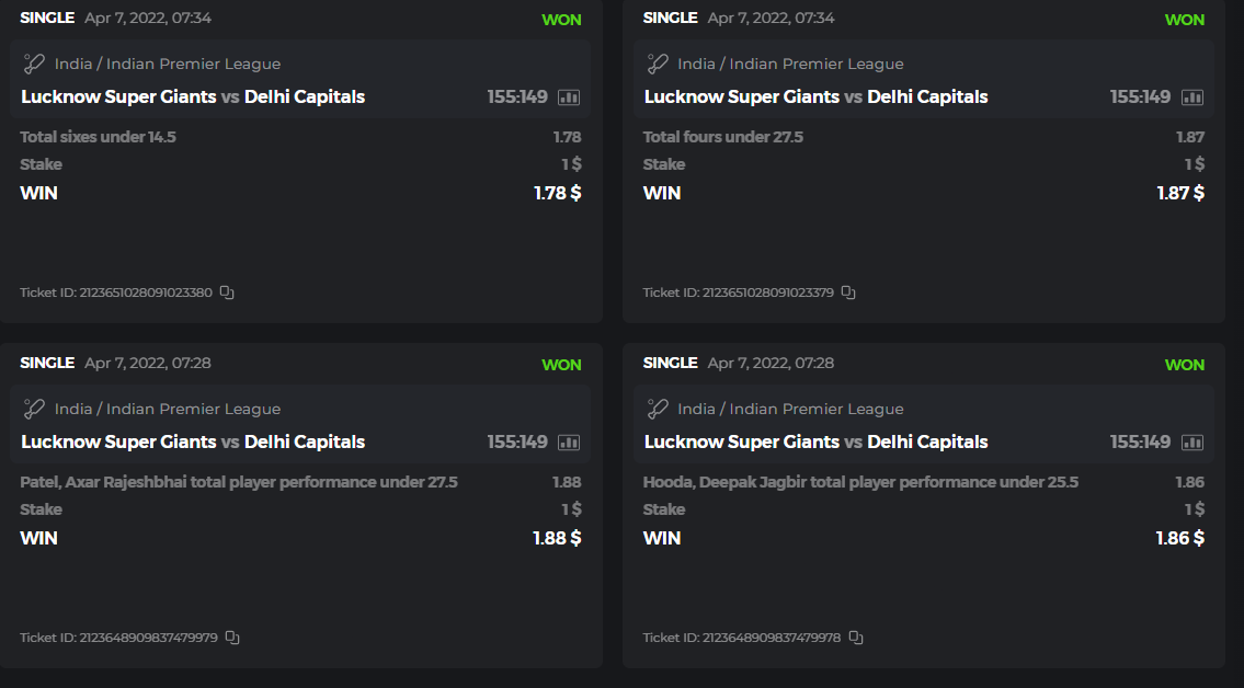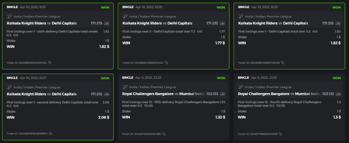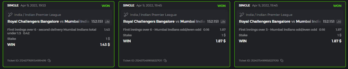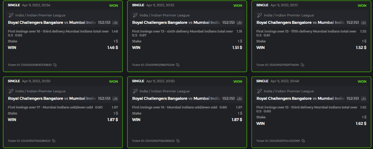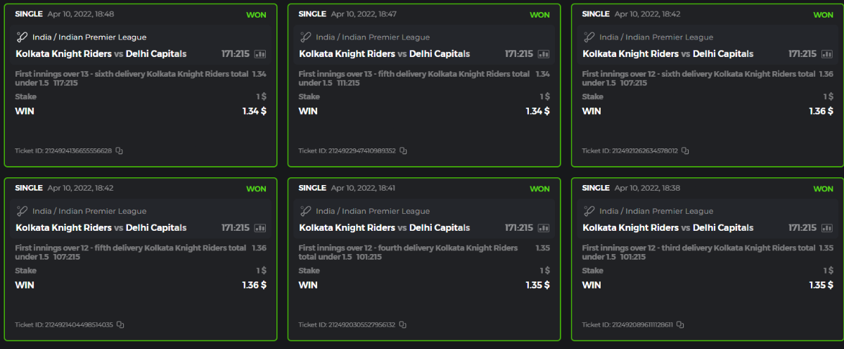 10. Well played bro but i Think your parlay combo bets are invalid because the Minimum odds pr match is 1.3 so you placed bet in combo of 4 than total odds must be atleast 2.8561 but total odds of your parlay combo bets showing 1.78 it means you have selected market lower then 1.3 in combo bet. please upload full screen shot like this of your combo bets so other competitors can see odds and can see that you have placed bets in IPl only in combo bet.. Thanks