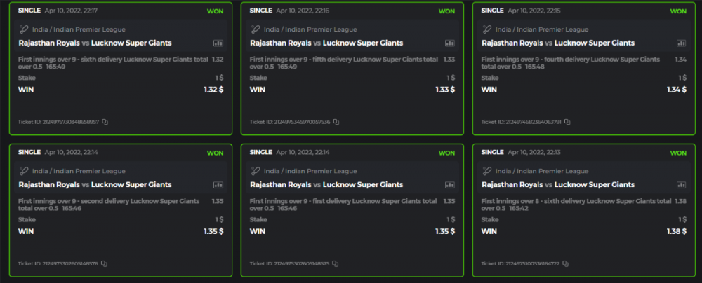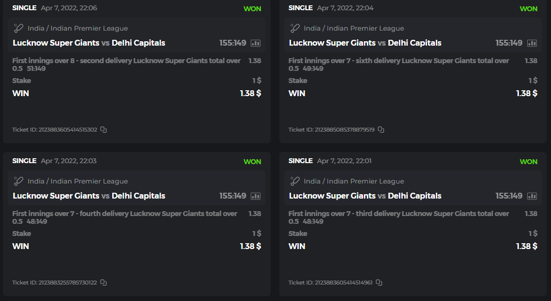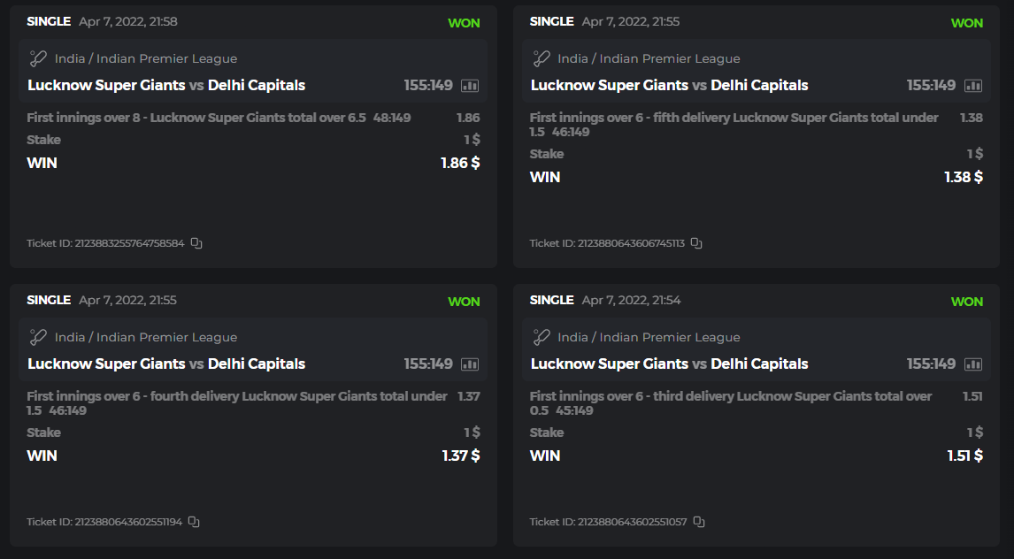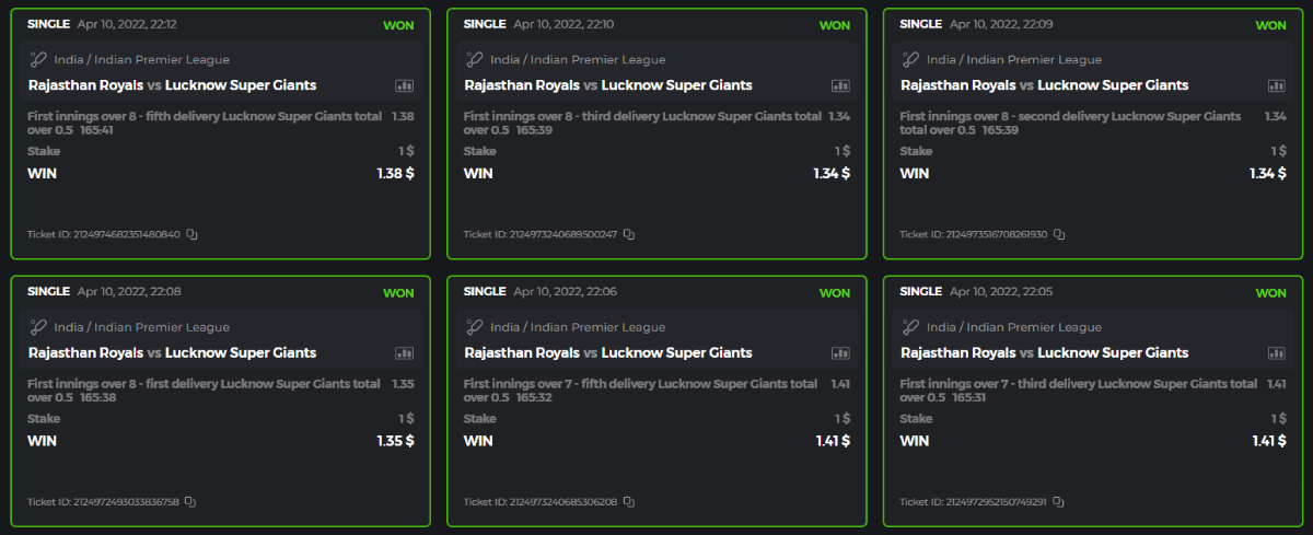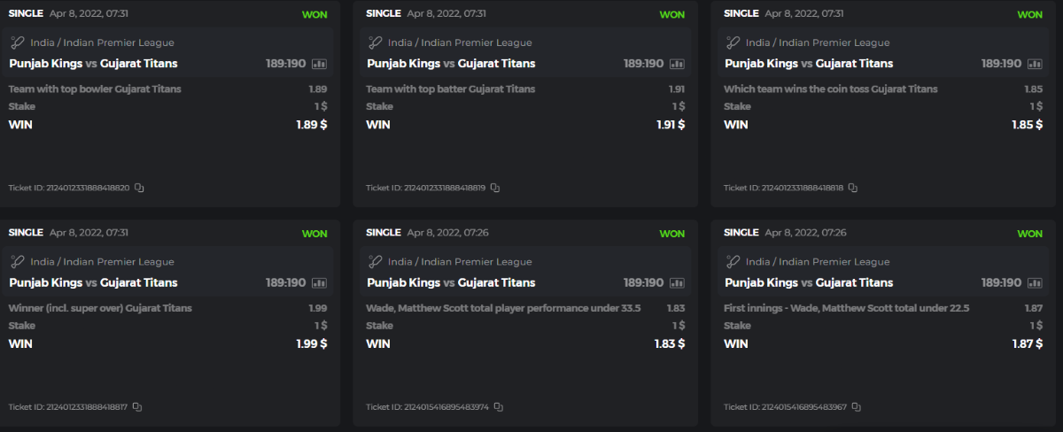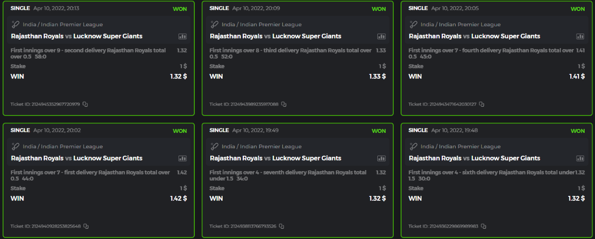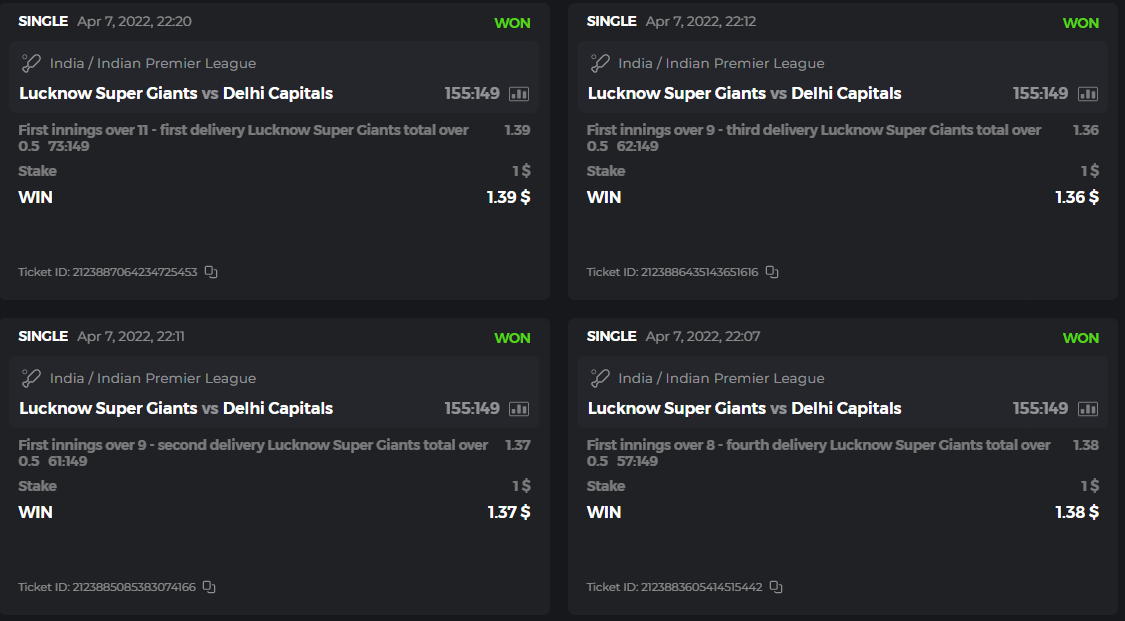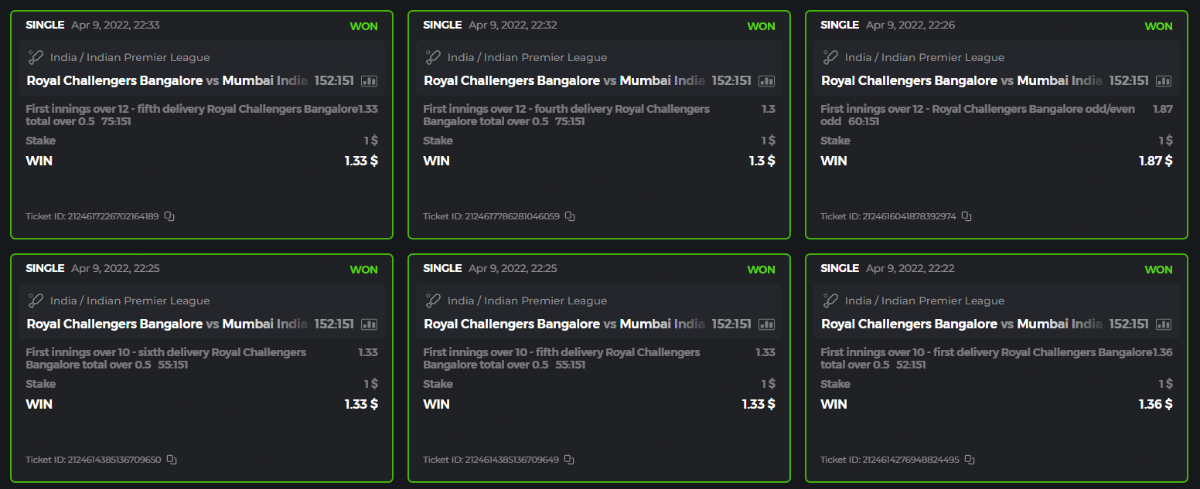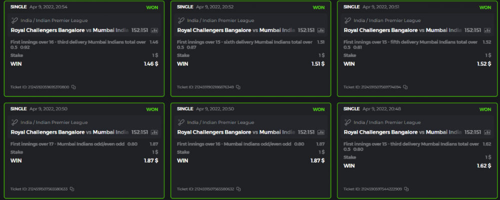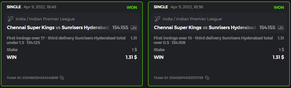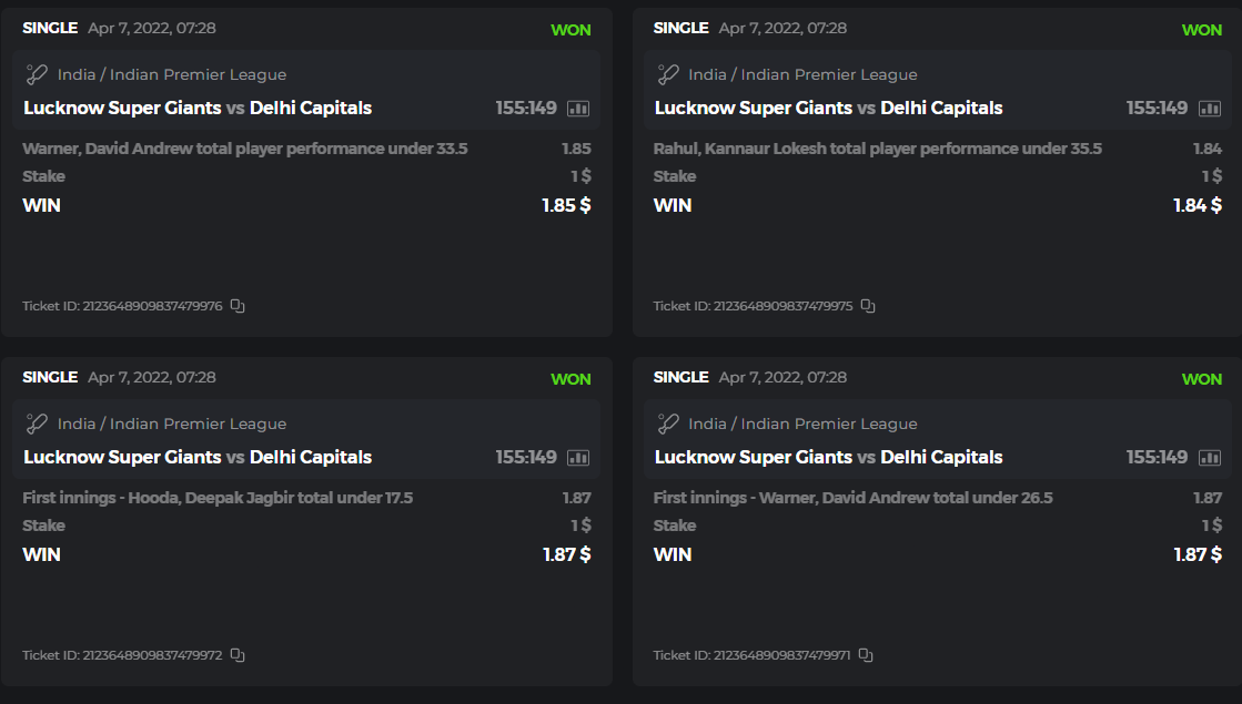 10. Well played bro but i Think your parlay combo bets are invalid because the Minimum odds pr match is 1.3 so you placed bet in combo of 4 than total odds must be atleast 2.8561 but total odds of your parlay combo bets showing 1.78 it means you have selected market lower then 1.3 in combo bet. please upload full screen shot like this of your combo bets so other competitors can see odds and can see that you have placed bets in IPl only in combo bet.. Thanks