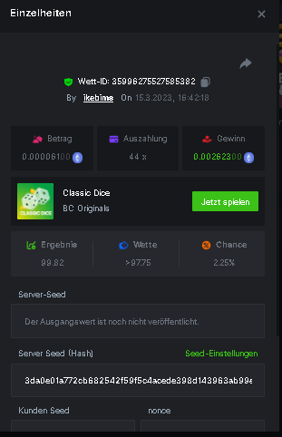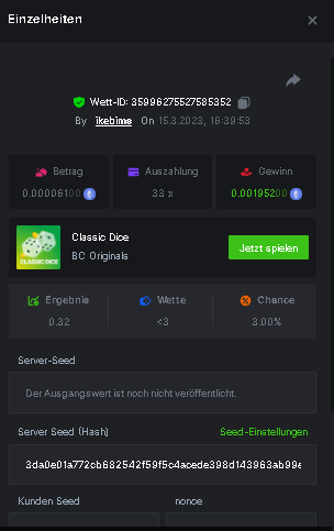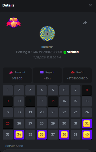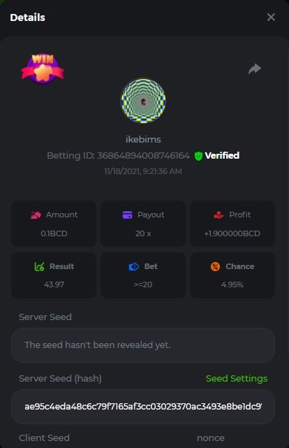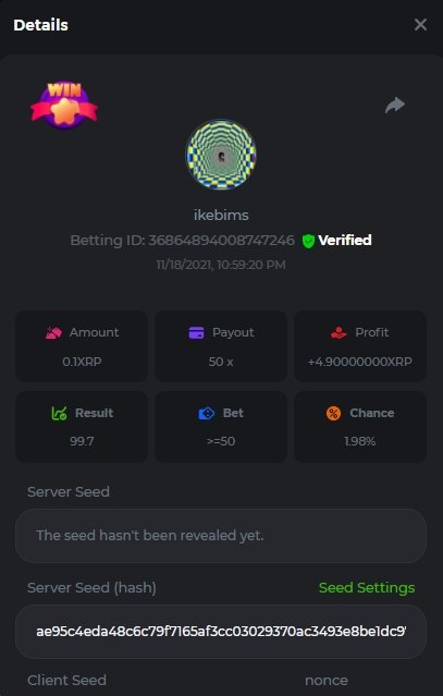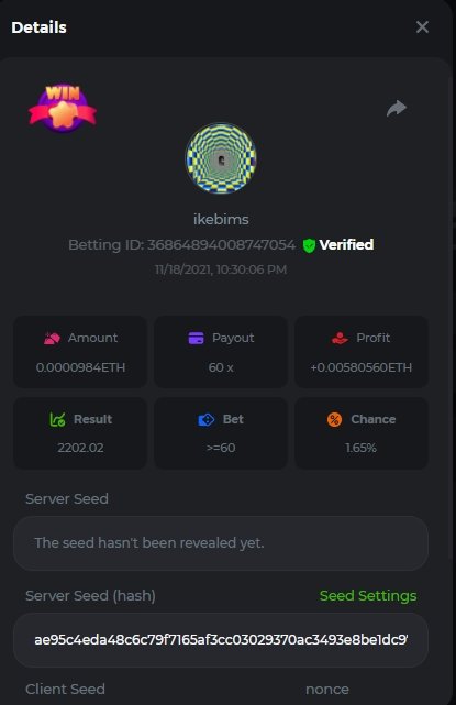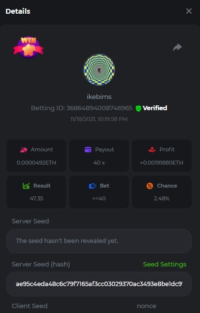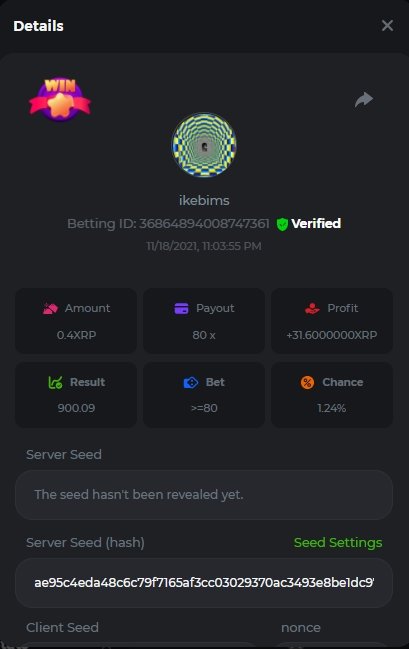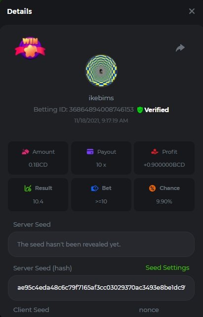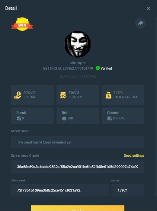 4. Username : chompik Bet-ID : 2599627740169779 Amount : 3.2 TRX (0.10$) Result : 0 --------------------------------------------------------- Bet-ID : 2599627740171432 Amount : 0.00004545 BTC (1.05$) Result : 12.25 -------------------------------------------------------- Bet-ID : 2599627740172381 Amount : 0.00003896 BTC (0.90$) Result : 0