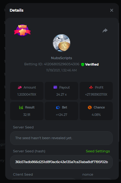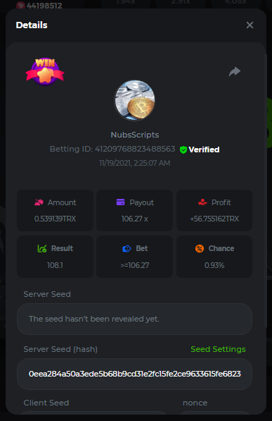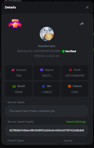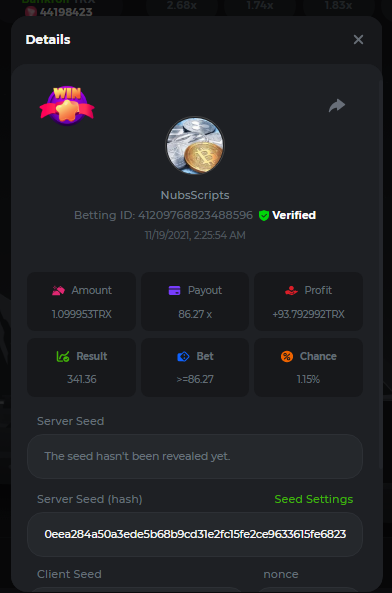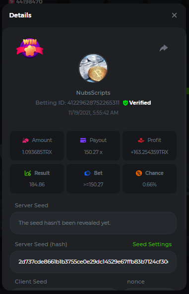 4. The get history has always loaded the previous 20 rolls. The only way to load more is to get from verification site which is beyond me. It grabs those 20 previous rolls because that's 20 more than just pressing Start and we want to see some sort of pattern before betting. It now adjusts the bet according to losses. The Update won't show correct Profit as the ability to call the currency.amount returns the same amount as when the script 1st started. To me this is old and spaghetti looking with crap all over it. This style of betting based upon losses generates a certain level of profit, but is not even close to basing bets on the Streaks % and pausing betting when no streaks. //******************* Nubs27's Smart Script for Crash ******************* // // // // If you find this script helpful please consider donating to Nubs27 or tipping on NanoGames.io: // Referral Link: https://n-luzqe.nanogames.io/ // // Donations accepted in many coin/token types. List & Addresses: // https://sites.google.com/view/nanogamescrashscripts/home/donation-addresses // // // var config = { mainTitle: { label: '*** Nubs27\'s Smart Script for Crash ***', type: 'title' }, auto: { label: '', value: 'Script', type: 'radio', options: [ { value: 'Script', label: 'Script chooses Base Bet'}, { value: 'Player', label: 'Player chooses Base Bet'} ]}, bet: { label: 'Base Bet', value: currency.minAmount, type: 'number' }, lossTitle: { label: 'Stop When ', type: 'title' }, stop: { label: 'Coins Lost >', value: 1, type: 'number' }, end: { label: 'Minutes >', value: 250, type: 'number' }, profit: { label: 'Profit >', value: 100, type: 'number' }, }; function main () { //PayOuts checked in the Stats Update const MultiplierArray = [2.5, 3.00, 5.00, 6.00, 7.00]; const LMultiplierArray = [10.00, 20.00, 50.00, 100.00]; var version = "v2.3"; var PayOutPercents = []; var PayOutConfidence = []; var Array2Filter = []; var FilteredArray = []; var ScriptHistory = []; var Trains = []; // Red Train IDs - finding gaps between & correlation between gap & duration var History = []; var RoundsPlayed = 0; var RoundsViewed = 0; var LastGameID = 1; var CurrentGameID = LastGameID + 1; var MinimumBet = currency.minAmount; var MaxBet = (currency.amount / 10); var TotalBets = 0; var CurrentMultiplier = MultiplierArray[1]; var LastMultiplier = MultiplierArray[1]; var MaxLossesEncountered = 3; var MostLost = 0; var LargestMulitplier = 2; var BaseBet = config.bet.value; var CurrentBet = BaseBet; var LastBet = BaseBet; var LastShrek = CurrentGameID; var LastTrain = 0; var Gap = 0; var AverageGap = 0; var LargestBet = [0,0]; var Enable100ID = 1000000; var LastResult = "Won"; var CoinLost = 0; var StopLossCoin = config.stop.value; var Losses = 0; var Wins = 0; var Red = 0; var Green = 0; var StartTime = new Date(); var EndTime = new Date(); var TimeDiff = (EndTime - StartTime); var StartBalance = currency.amount; var EndBalance = 0; var Profit = 0; var ATHProfit = 0; var ProfPerMin = 0; var NetProfit = 0; var DisplayGreeting = "False"; var GotHistory = "False"; var BetYet = "False"; var LoggedBetData = "False"; var GameInfoLogged = "False"; var StrategyFound = "False"; var IsPlaying = "False"; var UpdateBets = "False"; var Enable100 = "False"; var LastCrash = 0; var PrevCashOut = 0; var WonAmount = 0; var FindThisMultiplier = 1; var FindShouldHave = 2; var ThisAverage = 1; var HistorySlice = 50; var Paused = "True"; var IndexMax = PayOutConfidence[0]; var MaxIndex = 0; var GetNumber = 0; // Welcome the Player to the Script console.clear(); engine.on('GAME_STARTING', function () { if (DisplayGreeting == "False") { log.info(' Nubs27s Smart Script for Crash'); log.info(" ****************"); log.info("See Web Console for more Information (Press F12)"); console.log('%c~~~~~~~~~~~~~~~~~ Nubs27\'s Smart Script for Crash ~~~~~~~~~~~~~~~~~','color:Purple; font-weight:bold'); console.log('%cScript Start Time: ' + StartTime,'color:Purple; font-weight:200'); console.log(' %cWelcome ' , 'color:Purple; font-weight:bold'); console.log(' %cYour Starting Balance is: ' + StartBalance + ' ' + currency.currencyName, 'color:Purple; font-weight:bold'); if (config.auto.value == 'Player') { if (config.stop.value > currency.amount) { MaxBet = (currency.amount / 10); config.stop.value = currency.amount * 0.98; console.log('%c[WARNING]: Stop Loss is above your Bankroll','color:Orange; font-weight:bold'); console.log('%c[WARNING]: Stop Loss Updated to ' + config.stop.value, 'color:Orange; font-weight:bold'); } if (config.bet.value > (config.stop.value / 15000)) { log.info('[WARNING]: Script Recommends a bankroll of at least ' + (BaseBet * 15000) + '' + currency.currencyName + ' for the Base Bet you provided'); log.info('[WARNING]: Script Recommends a bankroll of at least ' + (BaseBet * 20000) + '' + currency.currencyName + ' for the Base Bet you provided'); log.info('[WARNING]: Script Recommends a bankroll of at least ' + (BaseBet * 25000) + '' + currency.currencyName + ' for the Base Bet you provided'); } console.log(' %cYou Input: ' + BaseBet + ' ' + currency.currencyName + ' as the Base Bet', 'color:Purple; font-weight:bold'); }else{ betupdate(); console.log(' %cYour Starting Base Bet is: ' + BaseBet + ' ' + currency.currencyName, 'color:Purple; font-weight:bold'); } console.log(' %cYour Stoppers are: Coin Lost > ' + config.stop.value + '; Minutes > ' + config.end.value + '; Profit > ' + config.profit.value, 'color:Purple; font-weight:bold'); console.log('%c~~~~~~~~~~~~~~~~~~~~~~~~~~~~~~~~~~~~~~~~~~~~~~~~~~~~~~~~~~~~~~~~~~','color:Purple; font-weight:bold'); if (config.stop.value > currency.amount) { MaxBet = (currency.amount / 10); config.stop.value = currency.amount * 0.95; console.log('%c[WARNING]: Stop Loss Updated to ' + config.stop.value, 'color:Orange; font-weight:bold'); } } DisplayGreeting = "True"; if (GotHistory == "False") { getnanohistory(); GotHistory = "True"; console.log(ScriptHistory); LastShrek = []; LastTrain = []; } // // // //Everything above here only run