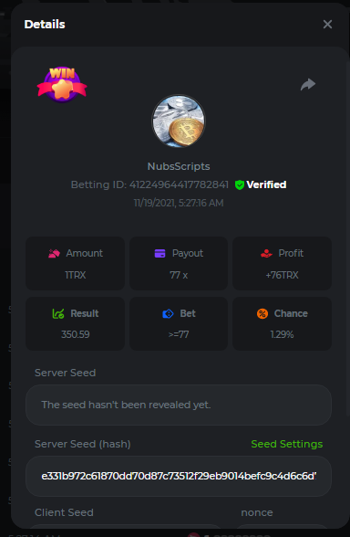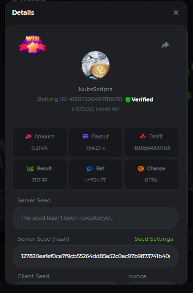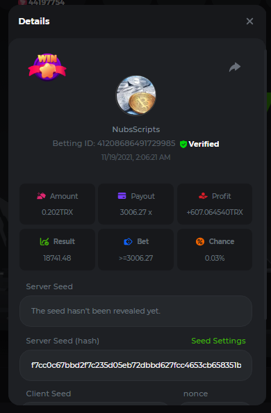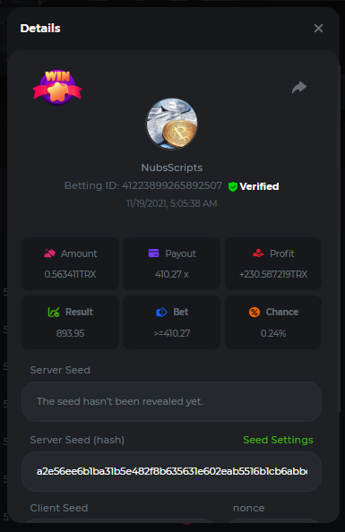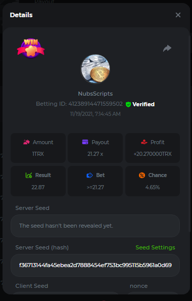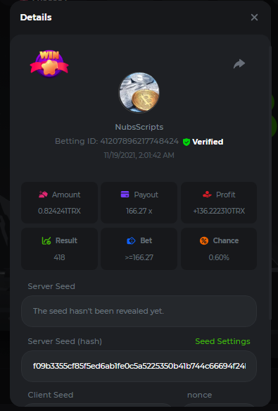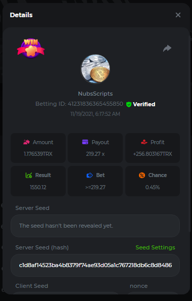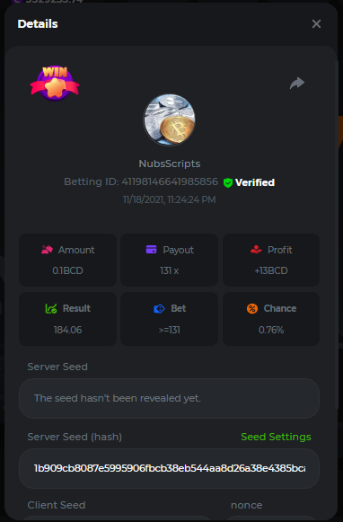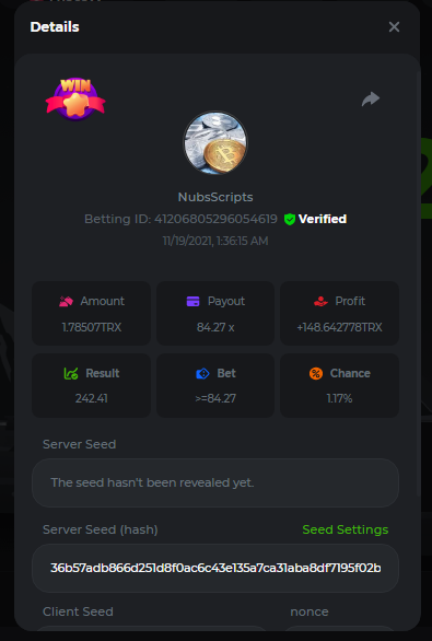 5. Yes this thread is a little old but hopefully you all are still around. I'm going to post a script from 3 years ago. I'm pretty sure the responses from server have changed so it won't run. However, this script will change the payout based upon the board. At one point it ran on ng for almost 30 days straight without interruption. Documented and posted screenshots along the way. Started with free 0.005 Eth from spider back then and got it up to 0.89 Eth and then I got scared and shut it down. //******************* Nubs27's Smart Script for Crash ******************* // // // // If you find this script helpful please consider donating to Nubs27 or tipping on NanoGames.io: // Referral Link: https://n-luzqe.nanogames.io/ // // Donations accepted in many coin/token types. List & Addresses: // https://sites.google.com/view/nanogamescrashscripts/home/donation-addresses // // // var config = { mainTitle: { label: '*** Nubs27\'s Smart Script for Crash ***', type: 'title' }, auto: { label: '', value: 'Script', type: 'radio', options: [ { value: 'Script', label: 'Script chooses Base Bet'}, { value: 'Player', label: 'Player chooses Base Bet'} ]}, bet: { label: 'Base Bet', value: currency.minAmount, type: 'number' }, lossTitle: { label: 'Stop When ', type: 'title' }, stop: { label: 'Coins Lost >', value: 1, type: 'number' }, end: { label: 'Minutes >', value: 250, type: 'number' }, profit: { label: 'Profit >', value: 100, type: 'number' }, }; function main () { //PayOuts checked in the Stats Update const MultiplierArray = [2.5, 3.00, 5.00, 6.00, 7.00]; const LMultiplierArray = [10.00, 20.00, 50.00, 100.00]; var version = "v2.3"; var PayOutPercents = []; var PayOutConfidence = []; var Array2Filter = []; var FilteredArray = []; var ScriptHistory = []; var Trains = []; // Red Train IDs - finding gaps between & correlation between gap & duration var History = []; var RoundsPlayed = 0; var RoundsViewed = 0; var LastGameID = 1; var CurrentGameID = LastGameID + 1; var MinimumBet = currency.minAmount; var MaxBet = (currency.amount / 10); var TotalBets = 0; var CurrentMultiplier = MultiplierArray[1]; var LastMultiplier = MultiplierArray[1]; var MaxLossesEncountered = 3; var MostLost = 0; var LargestMulitplier = 2; var BaseBet = config.bet.value; var CurrentBet = BaseBet; var LastBet = BaseBet; var LastShrek = CurrentGameID; var LastTrain = 0; var Gap = 0; var AverageGap = 0; var LargestBet = [0,0]; var Enable100ID = 1000000; var LastResult = "Won"; var CoinLost = 0; var StopLossCoin = config.stop.value; var Losses = 0; var Wins = 0; var Red = 0; var Green = 0; var StartTime = new Date(); var EndTime = new Date(); var TimeDiff = (EndTime - StartTime); var StartBalance = currency.amount; var EndBalance = 0; var Profit = 0; var ATHProfit = 0; var ProfPerMin = 0; var NetProfit = 0; var DisplayGreeting = "False"; var GotHistory = "False"; var BetYet = "False"; var LoggedBetData = "False"; var GameInfoLogged = "False"; var StrategyFound = "False"; var IsPlaying = "False"; var UpdateBets = "False"; var Enable100 = "False"; var LastCrash = 0; var PrevCashOut = 0; var WonAmount = 0; var FindThisMultiplier = 1; var FindShouldHave = 2; var ThisAverage = 1; var HistorySlice = 50; var Paused = "True"; var IndexMax = PayOutConfidence[0]; var MaxIndex = 0; var GetNumber = 0; // Welcome the Player to the Script console.clear(); engine.on('GAME_STARTING', function () { if (DisplayGreeting == "False") { log.info(' Nubs27s Smart Script for Crash'); log.info(" ****************"); log.info("See Web Console for more Information (Press F12)"); console.log('%c~~~~~~~~~~~~~~~~~ Nubs27\'s Smart Script for Crash ~~~~~~~~~~~~~~~~~','color:Purple; font-weight:bold'); console.log('%cScript Start Time: ' + StartTime,'color:Purple; font-weight:200'); console.log(' %cWelcome ' , 'color:Purple; font-weight:bold'); console.log(' %cYour Starting Balance is: ' + StartBalance + ' ' + currency.currencyName, 'color:Purple; font-weight:bold'); if (config.auto.value == 'Player') { if (config.stop.value > currency.amount) { MaxBet = (currency.amount / 10); config.stop.value = currency.amount * 0.98; console.log('%c[WARNING]: Stop Loss is above your Bankroll','color:Orange; font-weight:bold'); console.log('%c[WARNING]: Stop Loss Updated to ' + config.stop.value, 'color:Orange; font-weight:bold'); } if (config.bet.value > (config.stop.value / 15000)) { log.info('[WARNING]: Script Recommends a bankroll of at least ' + (BaseBet * 15000) + '' + currency.currencyName + ' for the Base Bet you provided'); log.info('[WARNING]: Script Recommends a bankroll of at least ' + (BaseBet * 20000) + '' + currency.currencyName + ' for the Base Bet you provided'); log.info('[WARNING]: Script Recommends a bankroll of at least ' + (BaseBet * 25000) + '' + currency.currencyName + ' for the Base Bet you provided'); } console.log(' %cYou Input: ' + BaseBet + ' ' + currency.currencyName + ' as the Base Bet', 'color:Purple; font-weight:bold'); }else{ betupdate(); console.log(' %cYour Starting Base Bet is: ' + BaseBet + ' ' + currency.currencyName, 'color:Purple; font-weight:bold'); } console.log(' %cYour Stoppers are: Coin Lost > ' + config.stop.value + '; Minutes > ' + config.end.value + '; Profit > ' + config.profit.value, 'color:Purple; font-weight:bold'); console.log('%c~~~~~~~~~~~~~~~~~~~~~~~~~~~~~~~~~~~~~~~~~~~~~~~~~~~~~~~~~~~~~~~~~~','color:Purple; font-weight:bold'); if (config.stop.value > currency.amount) { MaxBet = (currency.amount / 10); config.stop.value = currency.amount * 0.95; console.log('%c[WARNING]: Stop Loss Updated to ' + config.stop.value, 'color:Orange; font-weight:bold'); } } DisplayGreeting = "True"; if (GotHistory == "False") { getnanohistory(); GotHistory = "True"; console.log(ScriptHistory); LastShrek = []; LastTrain = []; } // // // //Everything above here only runs 1 time console.log(' ----------------------------'); CurrentGameID = (LastGameID + 1); console.log('[Round ID]: ' + CurrentGameID); if (StrategyFound == "False") { strategy(); } //Checks