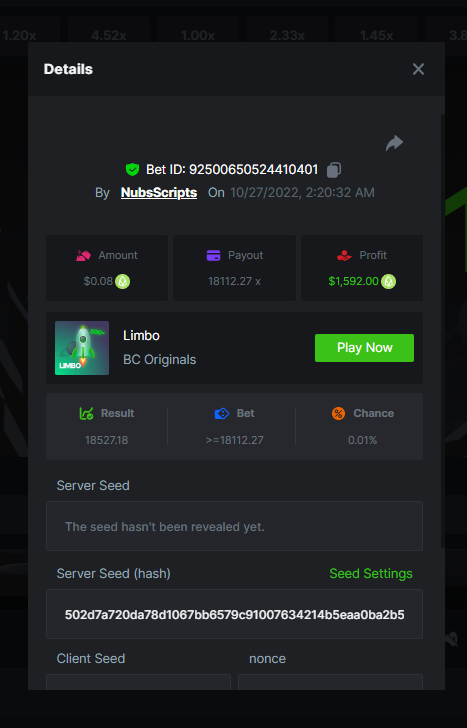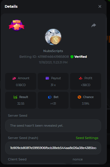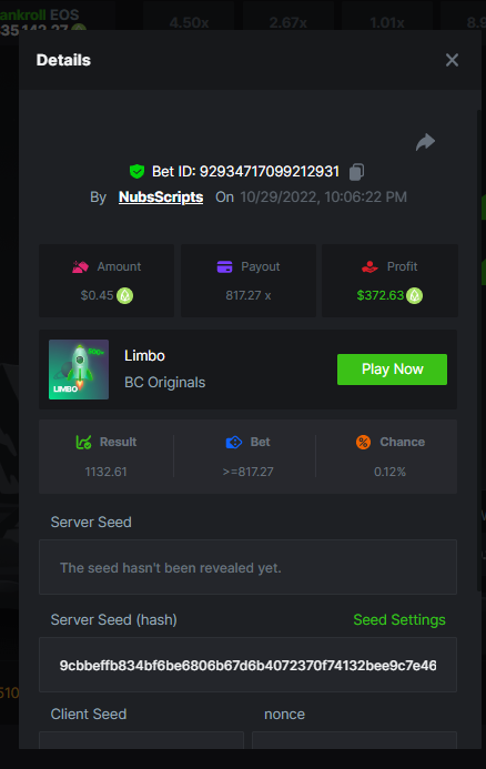 3. Thanks Skele, Yes, Cryptorichi that was the last version of the script I did. I now play manually with Hash Dice or Limbo. That script is based upon the losses you have incurred so far. It doesn't anticipate anything. Therefore, there will come a time when the gap between wins will be too great to overcome. By grabbing the last 2k rounds, I should be able to incorporate the Deep Learning api into it. Although it wouldn't be perfect it would return better results than the v2.3. We used to do it with Hash Dice until the game engine changed. Crash is really slow, I used to only play Crash, but now I rarely do. 14k rounds in a day for Crash compared to 100k rolls for Limbo/Hash Dice.