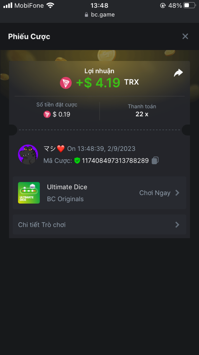 4. I've joined the forum event; Now it's your turn to win generous rewards from BC.GAME! Bet id : 2294427155662254197
