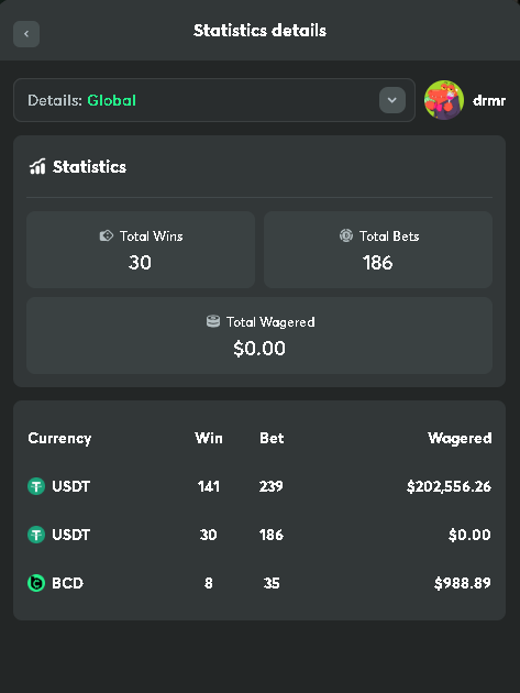 9. Hey @Liquidwalker we just did a brief check on UID: 65958920 on your request! He’s a sports bettor! Sports wagers don’t reflect in the main profile wager counter (casino only), which is why you see “$0” there. Checking Statistics > Details shows the real picture: 239 bets in USDT $202,556+ wagered So his raffle entry is fully valid. He is doing well! He is already rocking a 10k Profit Medal 'Chicken Dinner' while some of us are still grinding for years.