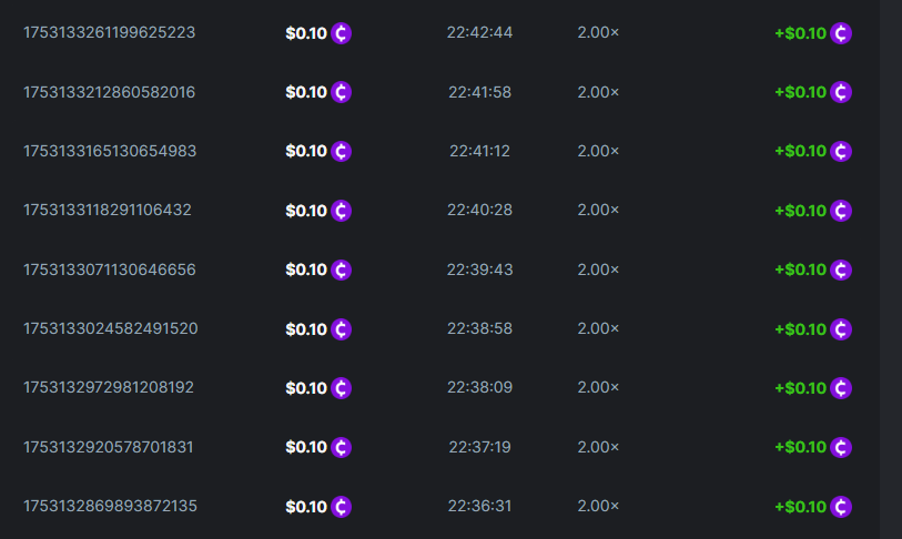 17. Consecutive hits (all red): 9 https://bc.game/#/sd/10ZY4XLO0RVSWJ https://bc.game/#/sd/10ZY4Y018DITJN https://bc.game/#/sd/10ZY4YF9STVE37 https://bc.game/#/sd/10ZY4ZCVRAAIHF https://bc.game/#/sd/10ZY50XAOZNYTV https://bc.game/#/sd/10ZY52M9LO89OZ https://bc.game/#/sd/10ZY548P4L2LG3 https://bc.game/#/sd/10ZY55XZHZUDCJ https://bc.game/#/sd/10ZY57NWNNSCNN