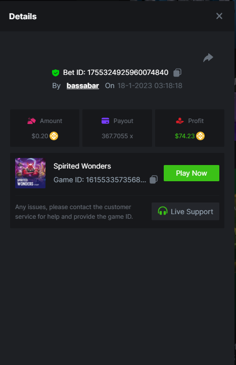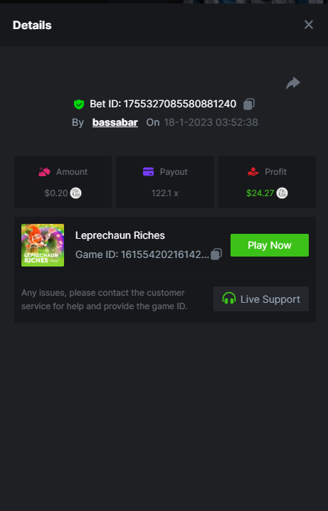 12. Total multiplier: 2041.4055x Bounty (50x): No Wild Bounty Showdown Multiplier: 192x https://bc.game/#/sd/111L2S7QLY7Z0Z Candy Bonanza Multiplier: 172.8x https://bc.game/#/sd/111LH482LDS8IB Leprechaun Riches Multiplier: 122.1x https://bc.game/#/sd/111M5CV5FB7BWZ Spirited Wonders Multiplier: 367.7055x https://bc.game/#/sd/111M38HURBKMJ7 Butterfly Blossom Multiplier: 140.5x https://bc.game/#/sd/111LXPWJ33GQOJ Supermarket Spree Multiplier: 156x https://bc.game/#/sd/1116EWRJVIJV2R Wild Bandito Multiplier: 200.4x https://bc.game/#/sd/111E8IB8DNVF9V Destiny of Sun and Moon Multiplier: 156x https://bc.game/#/sd/111DBDU26E1HXV Prosperity Fortune Tree Multiplier: 187x https://bc.game/#/sd/111M49IUVA2XAR Legendary Monkey King Multiplier: 346.9x https://bc.game/#/sd/111LMRJL9LSMJ7