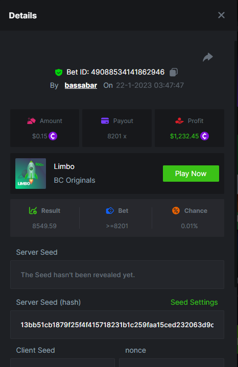 10. Multiplier: 8201x Bounty(500+): Yes https://bc.game/#/sd/111W230X59D1QR