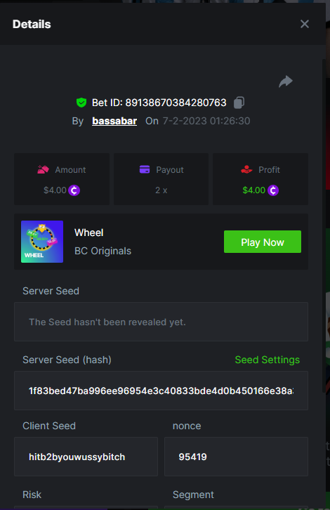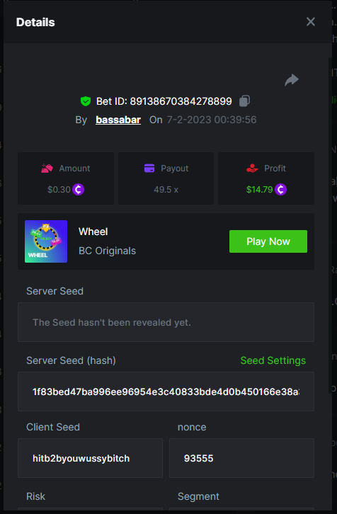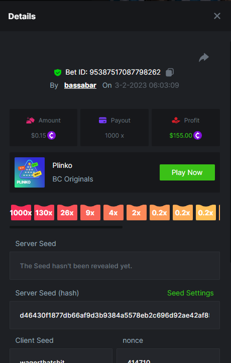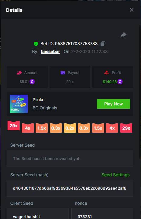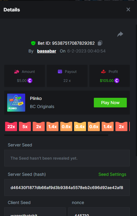 15. Total points: 5/5 Total basebets: $33.35 Average basebet: $6.67 Bounty: Yes Easy https://bc.game/#/sd/110P2GEB9P55W3 Medium https://bc.game/#/sd/110YI4M5HEO9W3 Hard https://bc.game/#/sd/110JPBPCZB78R7 Extreme (Bounty too) https://bc.game/#/sd/110JPME386IAZ7 Nightmare https://bc.game/#/sd/110JUZGK9PAPZN