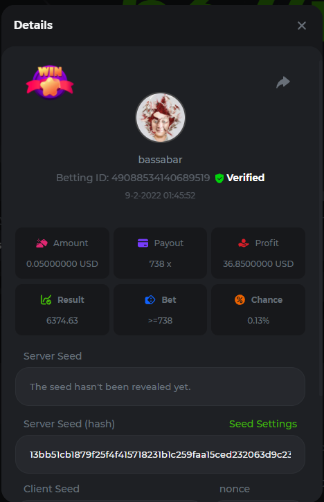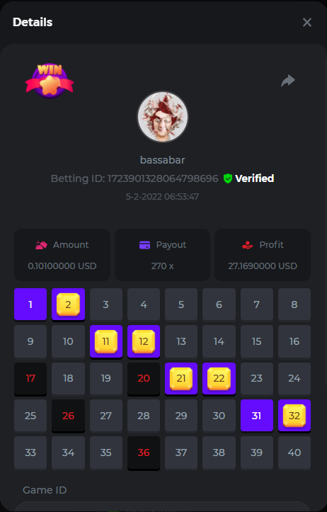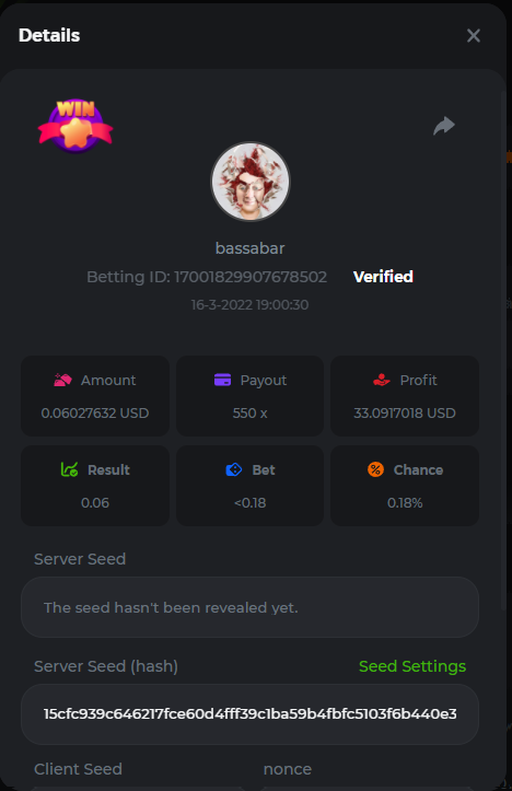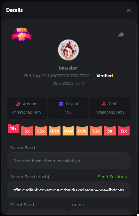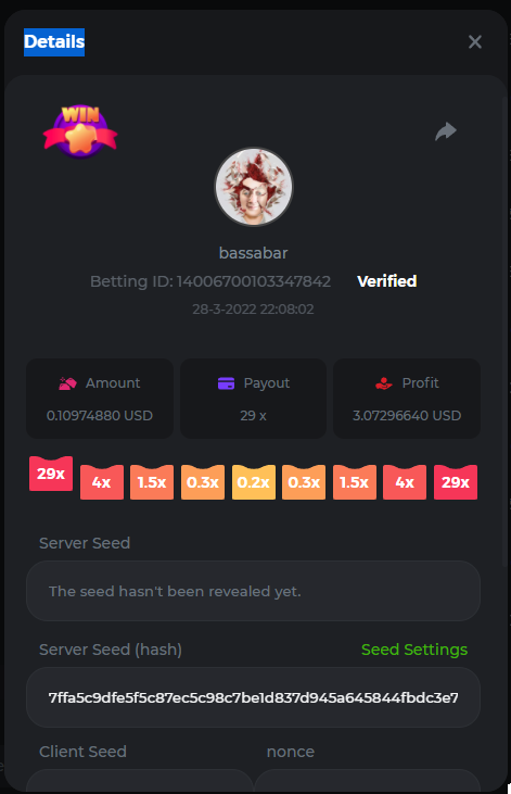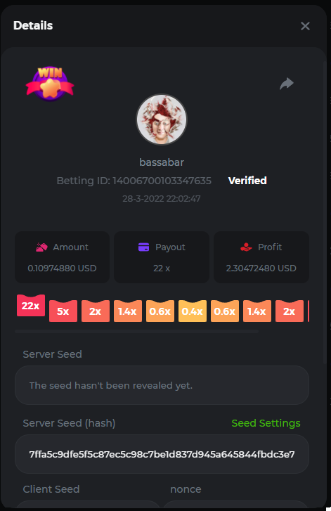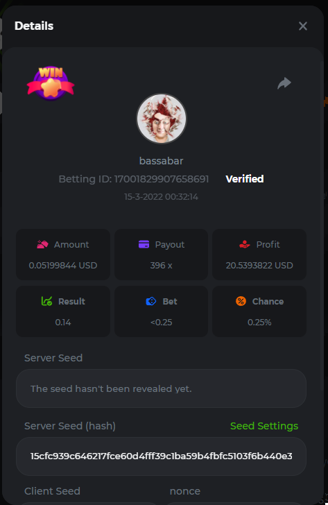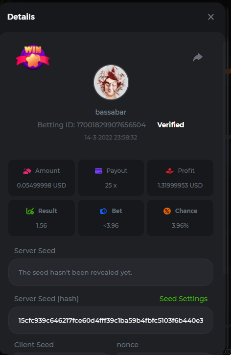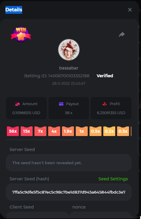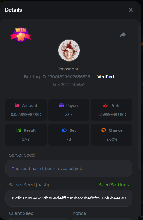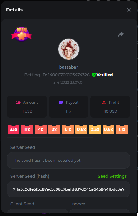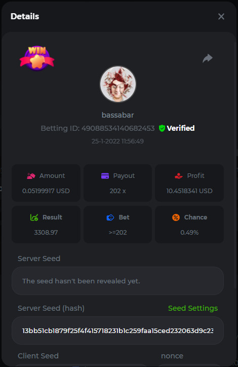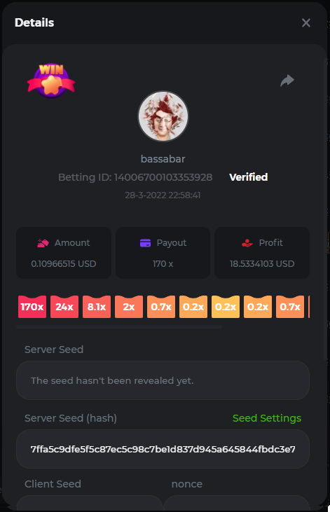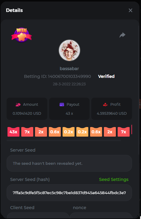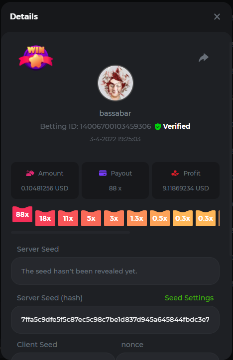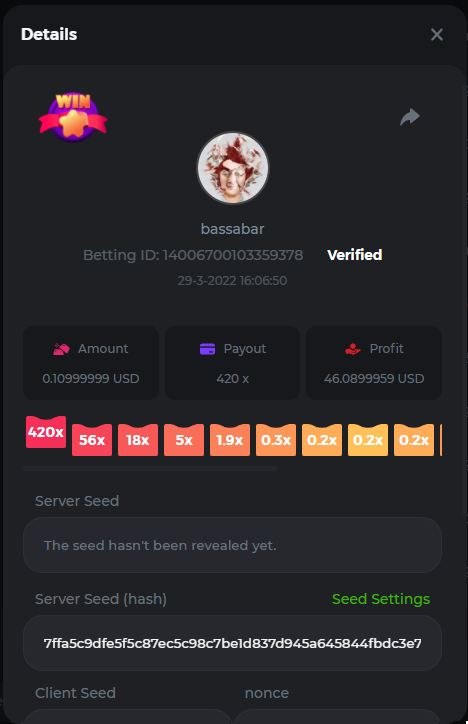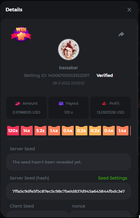 Multiplier: 3965.8928x Betting ID: 37852715010786023 Multiplier: 569.25x (for the bounty) Betting ID: 37852715010784878