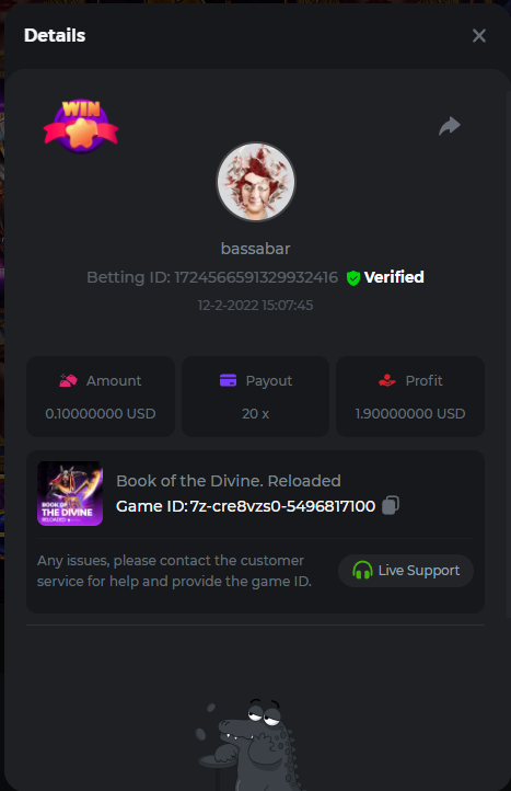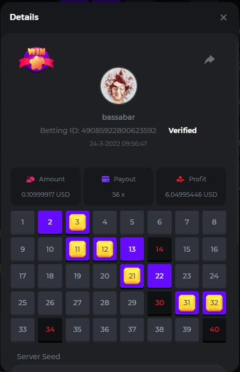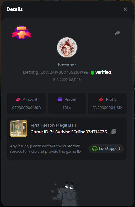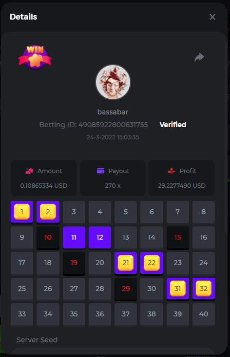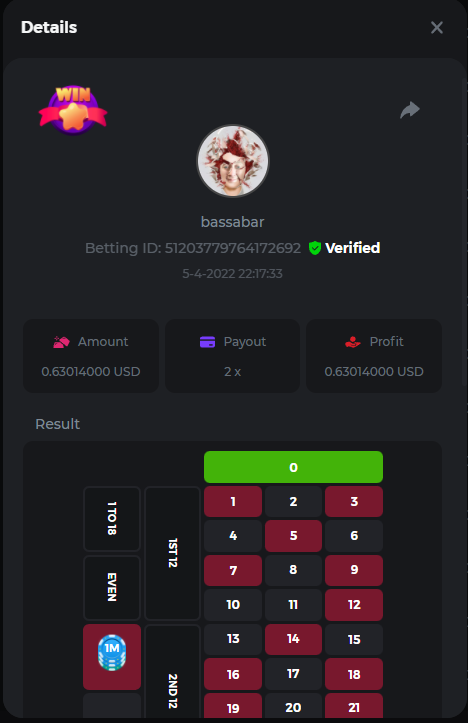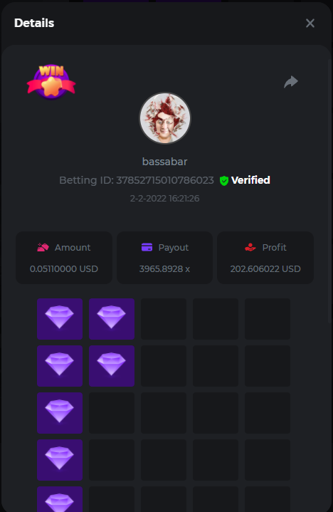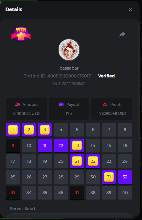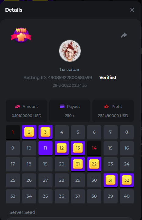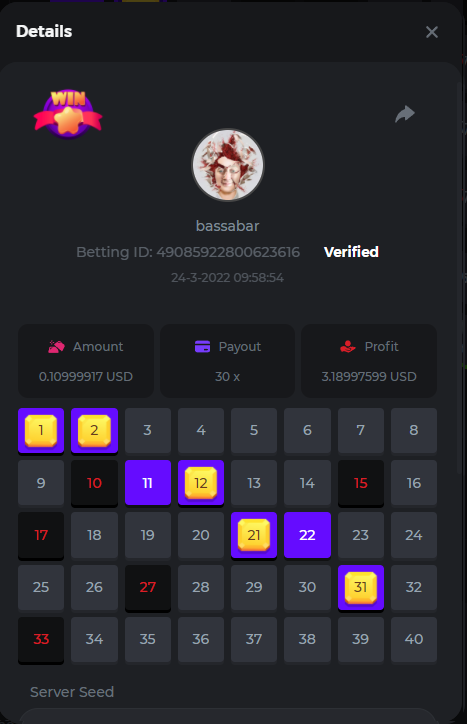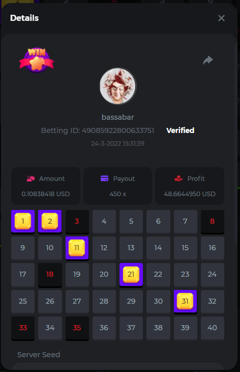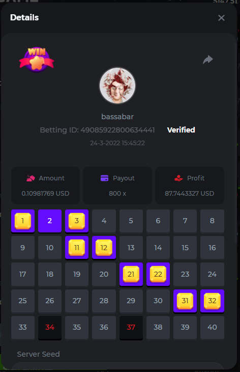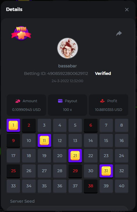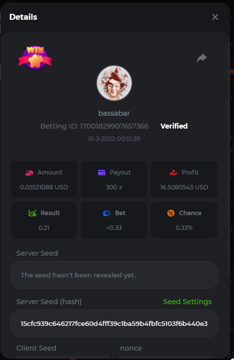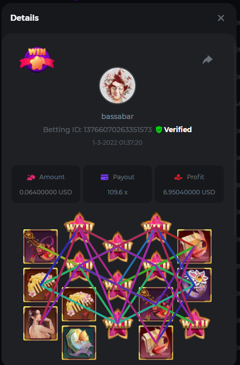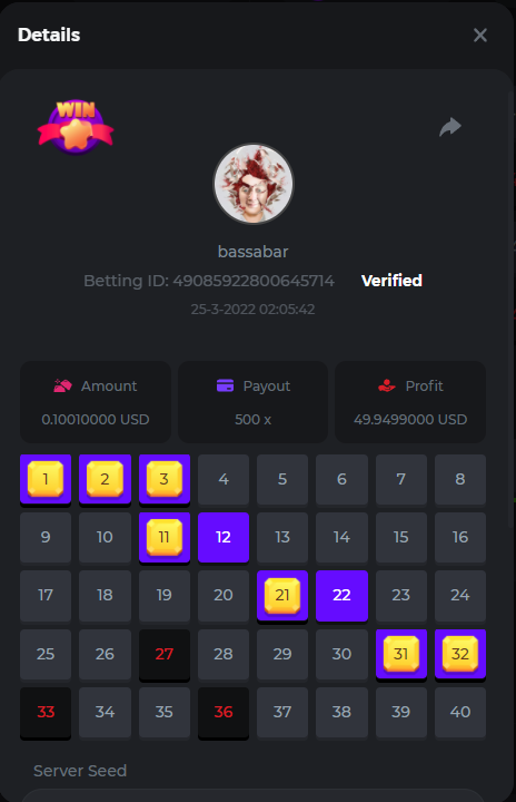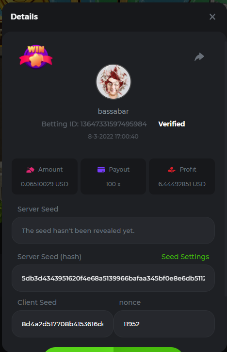 Multiplier: 3965.8928x Betting ID: 37852715010786023 Multiplier: 569.25x (for the bounty) Betting ID: 37852715010784878