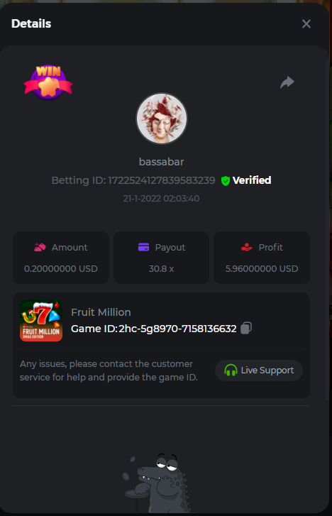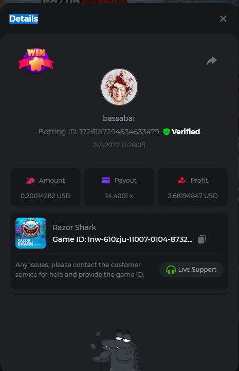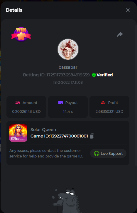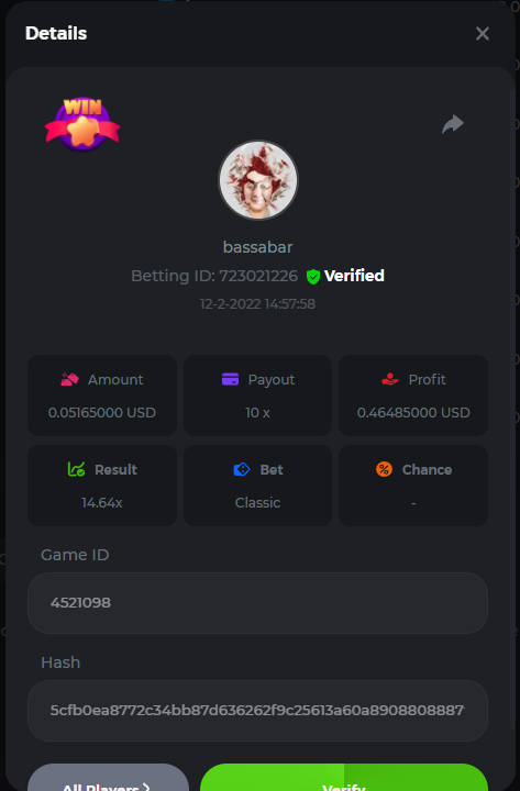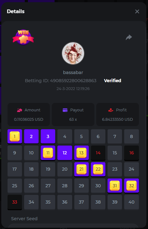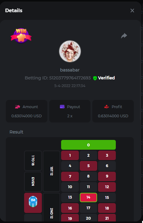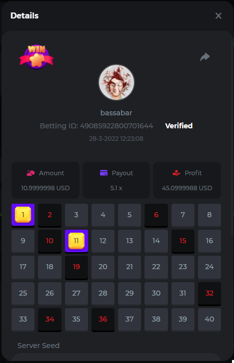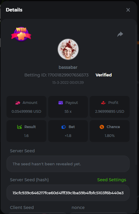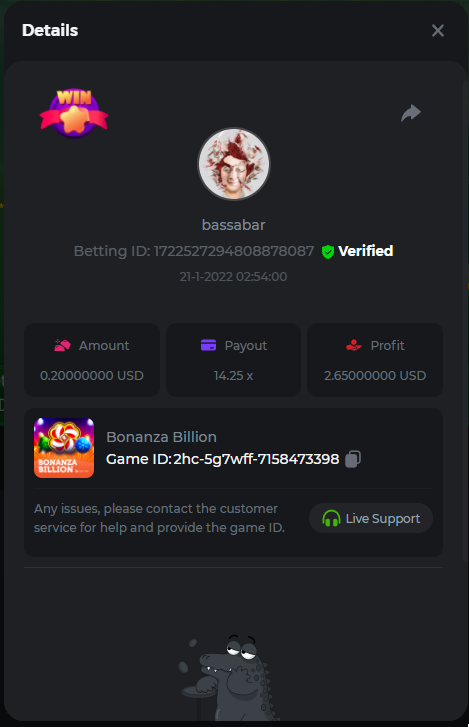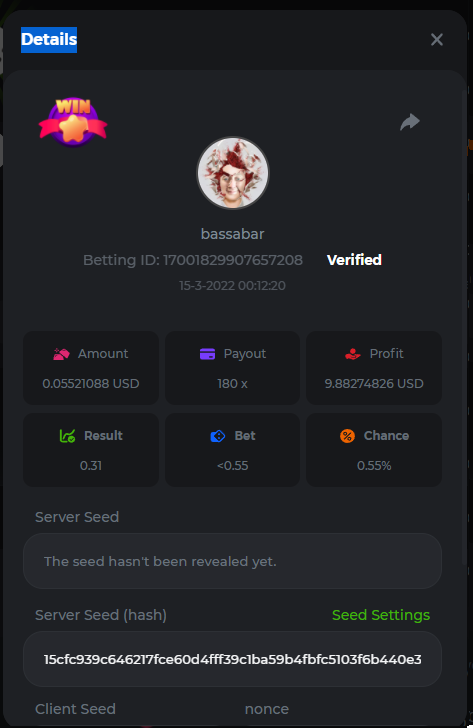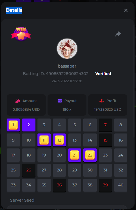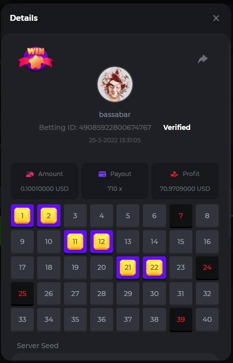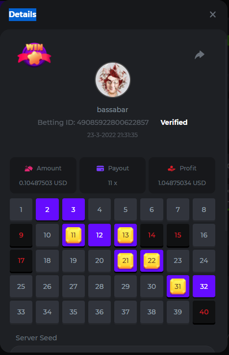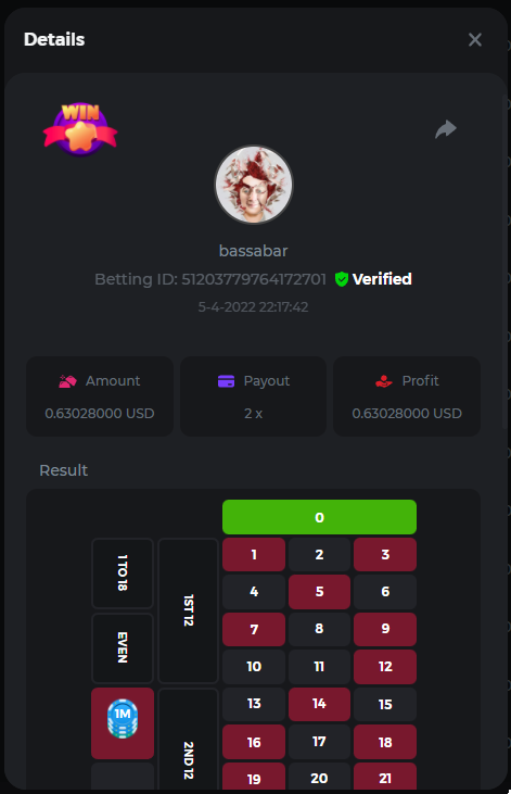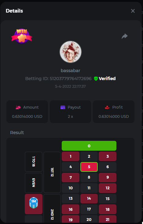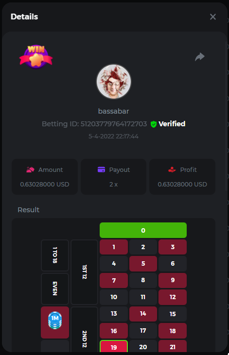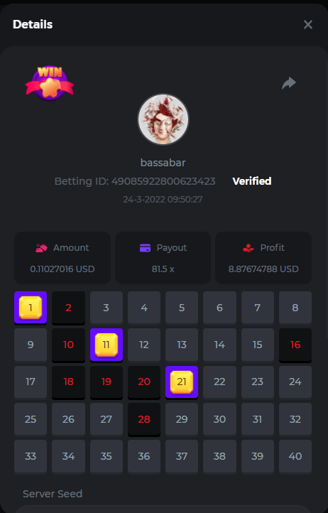 Multiplier: 3965.8928x Betting ID: 37852715010786023 Multiplier: 569.25x (for the bounty) Betting ID: 37852715010784878