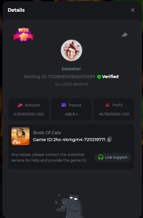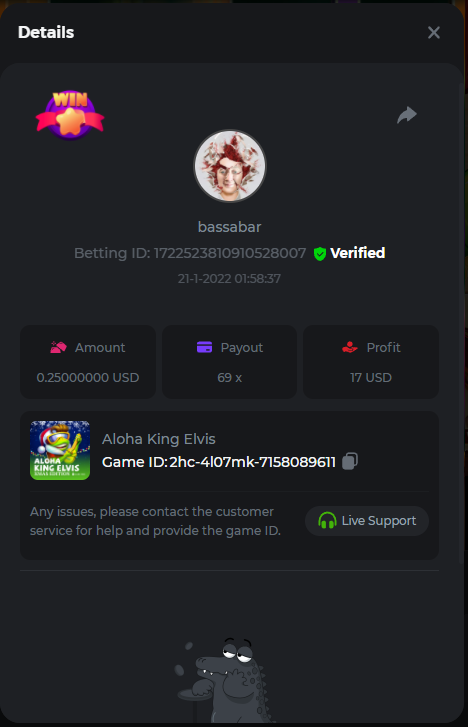 Book Of Cats Multiplier: 468.8 Betting ID: 17226818347803470599 Bonanza Billion Multiplier: 14.25x Betting ID: 1722527294808878087 Fruit Million Multiplier: 30.8x Betting ID: 1722524127839583239 Johnny Cash Multiplier: 281.25x Betting ID: 1722523381715153671 Aloha King Elvis Multiplier: 69x Betting ID: 1722523810910528007