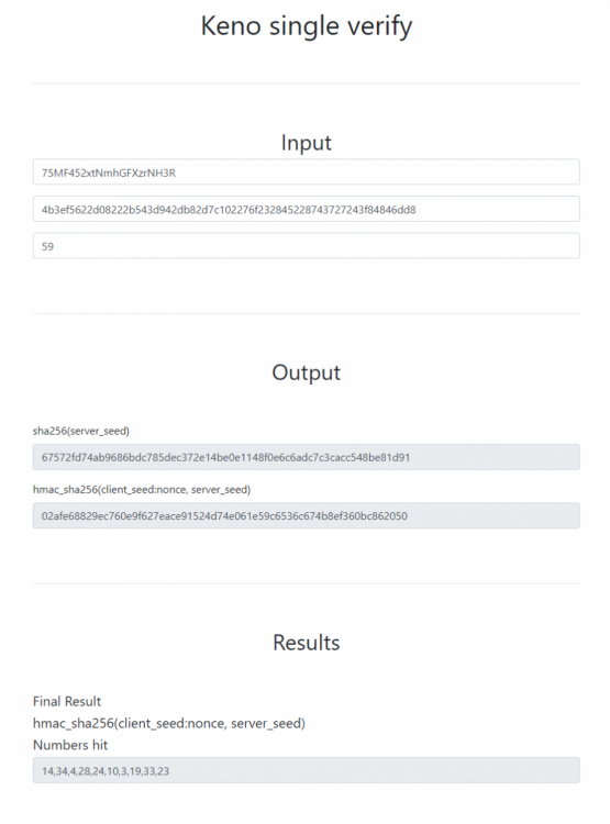 I'm not a big fan of adding graphics and stuff, just plain letters and numbers to check if its legit. I just used and combined code I found on github and bc.game to make it work. Its quite basic and no graphics, but easy to use for players. It is to verify the kenonumbers on kenosingle: https://trusting-leavitt-f9731d.netlify.app/keno single verify download: https://ufile.io/pbposcni