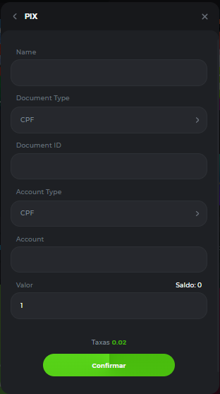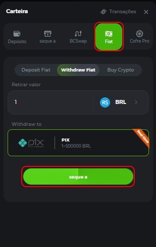 PIX (Brasil) Veja como sacar por PIX de forma simples seguindo os passos abaixo: Clique no símbolo de Carteira, no canto superior direito Logo em seguida, escolha a opção Fiat Logo em seguida, escolha a opção Withdrawal Fiat Insira o valor e selecione a opção PIX. Em seguida clique em sacar. Agora é a hora de fazer o preenchimento de seus dados! Preencha os campos obrigatórios: nome e sobrenome, e-mail e CPF. No campo Tipo de chave PIX, selecione a chave PIX. Você pode escolher CPF , telefone, e-mail ou EVP. Observação: A opção “EVP” é a chave aleatória. Você pode escolher essa opção se não quiser vincular seus dados pessoais às informações da sua conta transacional. Caso você ainda não tenha autenticação de 2 fatores (2FA) ativada, será necessário ativá-lo, antes do próximo passo Saiba mais Digite o valor que deseja sacar e clique em Confirmar. Confirme código da autenticação de 2 fatores, para completar a sua transferência. A taxa de retirada é de 1%, sobre o valor geral da retirada Você pode acompanhar o status da sua retirada em https://bc.game/transactions/withdraw/BRLFIAT O valor Mínimo de Saque é R$40,00 O valor Máximo por Saque é R$999.999,00 Atenção: Saque PIX não é permitido para contas de terceiros. O prazo máximo para seu PIX cair é de 24 horas.