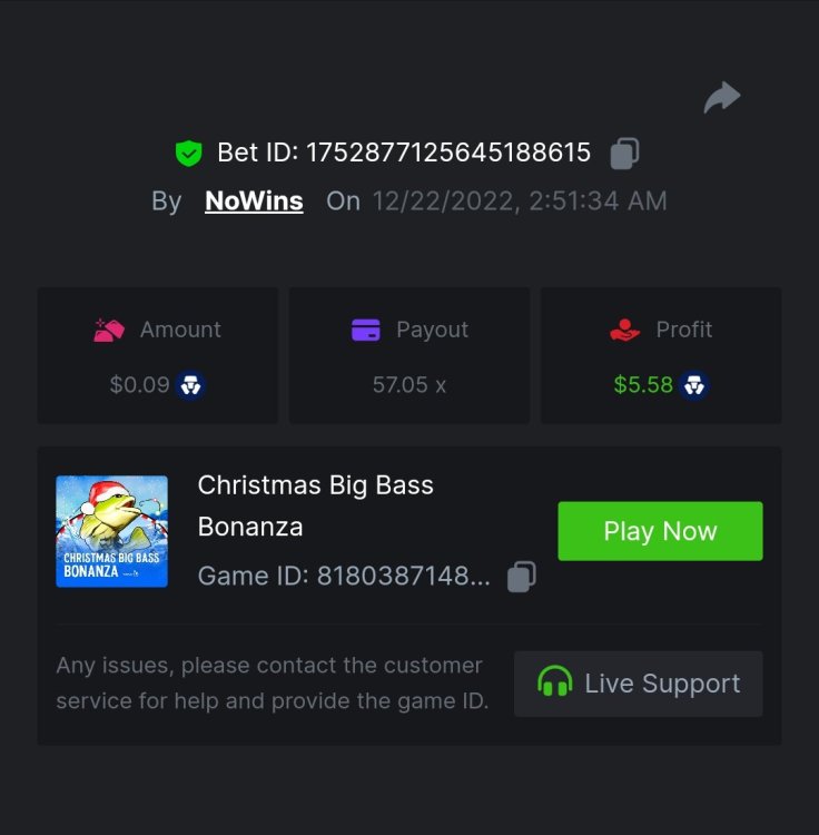 So many games to keep track of these days. This is just preliminary, and for my own sake to see what I've done Sugar rush - 1789.25x Gates of Olympus - 537.25x Sweet bonanza - 879.99x Madame Destiny Megaways - 592.75x Starlight Princess - 1258.31x Santa’s Great Gifts - 421.70x Bigger Bass Blizzard - Christmas Catch - 475.93x Pizza! pizza? pizza! - 600.03x Sweet powernudge - 1118.56x Hot pepper - 419.11x Fury of Odin megaways - 1069.53x Super joker - 189.97x https://bc.game/#/sd/110MGAL2XS7LSJ https://bc.game/#/sd/110FLLJMTWFGUR https://bc.game/#/sd/110KEWRKP5Y9LF https://bc.game/#/sd/110BOIZ04T5DZN https://bc.game/#/sd/110BSJPWHB0AVN https://bc.game/#/sd/110M42STGBYYHF https://bc.game/#/sd/110MX5W6CNXVRN https://bc.game/#/sd/110HTIASYG4S2B https://bc.game/#/sd/110MAWMRYEXV6B https://bc.game/#/sd/110K3EY69MGWER https://bc.game/#/sd/110M2R1YE4WZYR https://bc.game/#/sd/110I8VYSQ5DKIB BOUNTY https://bc.game/#/sd/110BYHKFG8ETQR -