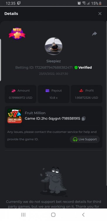 Sleepiez BGaming Candy Monsta (120.5x) Betting ID: 1719771673415153415 BetSoft Safari Sam2 (145.65x) Betting ID: 1720206799224722183 GameArt WolfHunt (66x) Betting ID: 1720209416468779136 NolimitCity Tombstone(145x) Betting ID: 1720210419231831047 Quickspin Most Wanted 3(106.88x) Betting ID: 1720214130037355392 Playson Book of Gold2 (114.75x) Betting ID: 1720237312263717504 Habanero Betting ID: 1720240090905229184 Pragmatic Xmas Carol 92.4x Betting ID: 1720297147592160519 Tiresome event playing so many slot just for 2000cash prize for 10player. Can you atleast have some automated scoring script so we dont need to keep posting one by one.