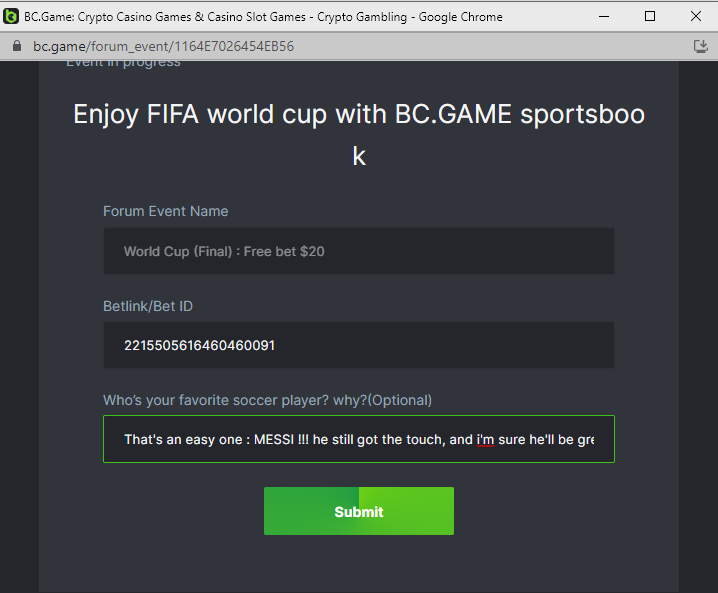 4. I've joined the forum event; Now it's your turn to win generous rewards from BC.GAME! 2215505616460460091 Let's go Argentina, LFG Messi !!!