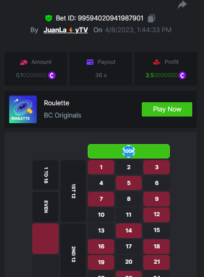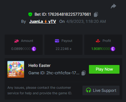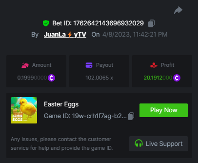 Easy 1. Win a Classic Dice bet with a 5x payout. https://bc.game/#/sd/11753S5GFRO2KZ 2. Win a 'Tie' 9x bet on the Baccarat. (no spread bets) https://bc.game/#/sd/11753V9Z4OZI1F 3. Get a 10x payout on a Crash bet. Make sure you catch the moon. https://bc.game/#/sd/117664TZCBXQFN 4. Get a 10x payout on the Egyptian Adventure. https://bc.game/#/sd/11754QJ7EREADV 5. Get a 20x payout on the Oriental Beauties. https://bc.game/#/sd/117556Q0HIN2FN 6. Win a Cave of Plunder bet on 7.50x payout (Completing all book symbols). https://bc.game/#/sd/11755DC2MO0W7N 7. Win a Sports bet with minimum odds being 1.5x (singles only) 1$ base min amount. 2256443882550203095 8. Get a minimum 20x multi on BGaming Hello Easter slot. https://bc.game/#/sd/1176DZOUF7HQ8J 9. Get a minimum 30x multi on Red Tiger Lucky Easter slot. https://bc.game/#/sd/1176EG3EDFI3V7 10. Enable 2FA for your BC.Game account + Verify E-Mail & Phone Number (If it's already activated, keep it activated). Medium 1. Win a bet in Roulette Single with betting on 0 only (36x). (no spread bets) https://bc.game/#/sd/117570EUE5982B 2. Get a 76x on Plinko. https://bc.game/#/sd/11761FG36E85CJ 3. Win 99x multi on Ring of Fortune. (no spread bets) 4. Win a Sports bet with minimum odds of 2x (singles only) 1$ base min amount. 2256444139656851877 5. Win a bet with Straight Flush in Video Poker (60x). 6. Win a bet on Keno Single by selecting numbers 7, 30, and 8, Medium risk. (50x). https://bc.game/#/sd/117585JEUEVE37 7. Win a bet by getting a natural Blackjack (A+K/Q/J/10) with only red cards in it. 8. Get a minimum 90x multi on BGaming Easter Heist slot. 9. Get a minimum 100x multi on Play&Go Easter Eggs slot. https://bc.game/#/sd/11768H7D93BSB7 10. Get a minimum 100x multi on No Limit City Bonus Bunnies slot. Hard 1. Get a 49.50x on Wheel (50 segments, High risk). https://bc.game/#/sd/1175AL07QWGYDV 2. Get a 420x on Plinko (14 rows, High risk). 3. Win with a minimum 500x multi on Limbo. 4. Get a minimum 506.88x on Tower Legend. 5. Win with a minimum 999x on Crash. 6. Post a winning bet with 21 mines and 3 diamonds on Mines game, (569.25x). 7. Win a bet on Keno Single by selecting numbers 10, 11, 12 and 13, High risk, (259.00x). https://bc.game/#/sd/11758J3N21Q58Z 8. Get at least 300x multi on Pragmatic Play Rabbit Garden slot. 9. Get a minimum 300x multi on Wazdan Burning Sun Easter slot. 10. Win a Sports bet with minimum odds of 10x (any bet allowed) with 1$ base min amount. -