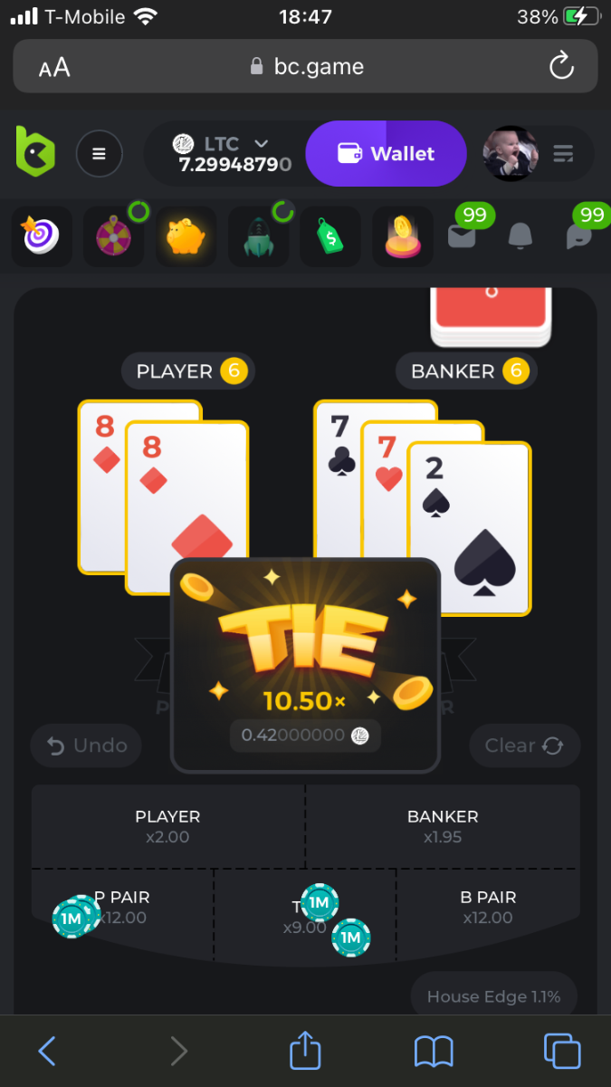 UnwillingNate Posted July 29, 2022 Author Share Posted July 29, 2022 In this case, i should receive 0.84. because i won pair and tie in total x21 as it shown. I dont know, maybe BC game need to explain. Its funny when they told if you single bet pair, you will win 12x but if you bet in tie also. Your winning is (12x + 9x )/2 = 10.5 because double side bet. ready to this if you double side pairs bet (12x + 12x )/2 =12x How insanity of their explanation? Dont believe me go try the game for yourself lol. Dear oh dear the baccarat, sorry it a scam payout, suggest that only place a single bet only. Otherwise you will get rob instant Link to comment Share on other sites More sharing options...