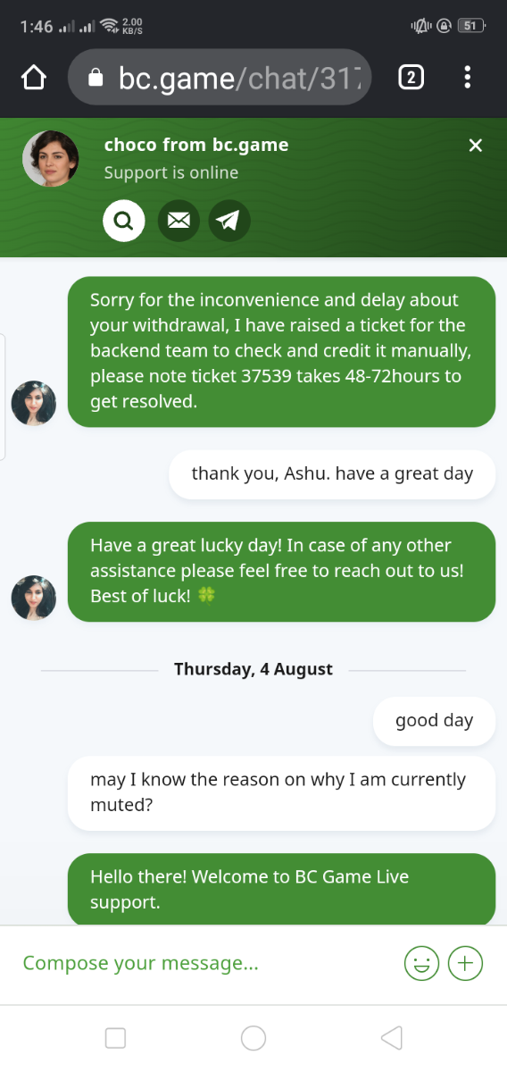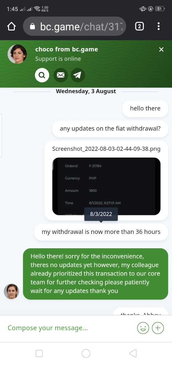 Please check the screenshots, and it will explain on how very poor the service of bc.game live support. No wonder, even the CS Manager of bc.game is not practicing a good customer service. I am just wondering on why bc.game  management is allowing such things, or do the management know what is really happening? Idk... I hope that a little improvement may happen in the future.