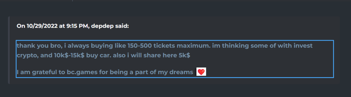 illoveyoubc Posted November 2, 2022 Share Posted November 2, 2022 On 10/30/2022 at 11:05 AM, depdep said: thank you guys, i bought like 400-500 ticket and then i wake up i see i didnt believe i won. i was be so happy. when my suspended problem solve, i will share who reply this post 5k$ share tip. support still checking my documents, i trust bc.game, i hope they will fix suspended problem, after i will share here 5k$ tip. Congratulations sir Link to comment Share on other sites More sharing options...