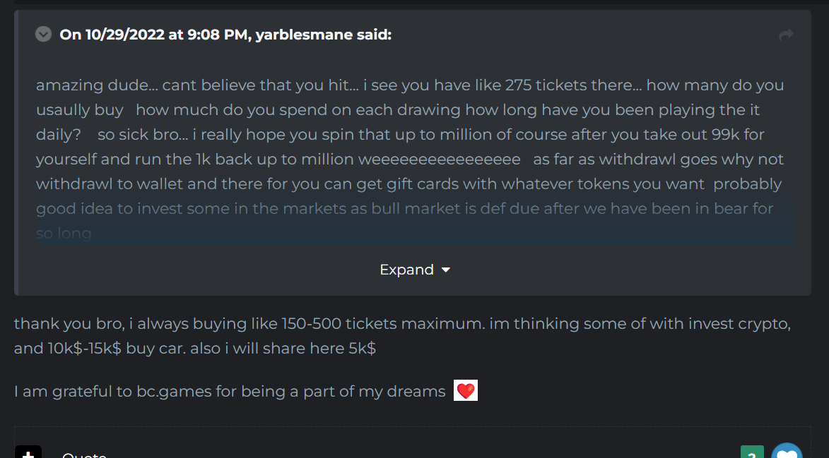 yarblesmane Posted November 2, 2022 Share Posted November 2, 2022 9 hours ago, depdep said: The event ended here because everyone texted me. Please dont dm anymore, Private messages will not be answer. 9 hours ago, Cocor said: and my name?? why is not my name?? 9 hours ago, depdep said: username winner:NoWins winner first he contact with me, i sent it. I'm sorry dude, you were eliminated because your comment was so ridiculous. How can I play $400k in games if I don't make a deposit? 9 hours ago, Cocor said: I think you were wrong friend, I didn't tell you that chek my comment, this is my only response men i dont think english is his first language... hehe even tho most of us with it being our first you couldnt tell from our grammar but i did nothing but support him contact vip host for him even coddled him a bit cause he sounded super nervous and anxious over it or maybe it was me having anxiety for him as to me it would be something of a life changing amount only because of a tragic accident i had but besides that when others started to chime in about where is there tips i only stated the obvious that nobody has to tip anybody anything that its his choice and to promise 5k tip was probably something said in the haste of it.... can you imagine you just won 100k and then your account gets locked.... i know id be like sucking air through a straw until i get that lovely confirmation everything is clear and i was celebrating my birthday with my fiance and mother in law at the time and they saw the thread up on my big screen and kept asking if my friend got his money so it became the topic of discussion haha like i want to be all invested in someone else winning... but it carried conversatino over to my purchase of lottery tickets adn asking them to give me numbers to pick 5 hours ago, MaeGear5thwb said: Nice and fair salute to this guy and he never lies when he said he will do it Keep it up and keep playing that lottery who knows you win max again but when it was all done and said to not even be included in a lottery type tip where you states he did what he said he would do but in actuallity he said he would tip 5kor share 5k to me that sounds like from the moment he said that anybody coming in after should not be included and the 5k should be split evenly between the people that had actually posted before his last mention that he would split 5k 10.29 at 9 15 p or not where do you draw the line... what if 1000 people post in next hour lol and the ywould have had they known they could get .50 cents never mind a dollar and tried to help even if no money was offered or tips were offered that would of been sticking to what he said not to mention how many people can abuse the forums and have multiple accounts set up to secure different contest wins and codes im not saying anybody who won doesnt deserve it or did anything wrong really just stating why bc requires min rank vip level to be included in events set up just like this one so its not abused so before you point out he did what he said he would do first make sure that its actually the case thats his perogotive and this thread was done to get help with an accvount issue that maybe others who have had the experience with it could chime in or at the best get a speedy recovery and at the worst offer a little coddling and relief of anxiety while waiting for support to come in and do what needs to be done. im sure i was excluded from the runnings because i opened my mouth and stated to others who were asking where their tips are to have a little patients at best and at worst sometimes people get a little zeoulus in the heat of the moment and might not have meant what they said we can all attest to a time when we actually said something with actual words but didnt think it thru clearly and should be understood later on where everyone could reason that instead of just splitting 5k with few people who posted prior to offer and letting anyone and everyone to come in and post after the fact for what was a longer time then the thread had actually been open up to that point so yeah what was suposed to be spreading joy and cheer withothers ended up making few people feel terrible and sad.... but not hating really glad he won and i hope he keeps winning if for nothing else if thats what is done when winning big sums of money id hate to see how yit is when losing the same... the world probably doesnt want to see that either. i stand by what i said he has the choice to do whatever he wants but its only my opinion that he wanted to to spread joy and cheer and share the excitement of a big win excluding people from the contestg who was promised a split of 5k between the dozen or less people to not even get a shot at the spin cant possibly be his intentions so yeah english misunderstandings is where i hope this got twisted and not intentionally trying to be narsisistic and mess with others emotions as what happened here. Link to comment Share on other sites More sharing options...