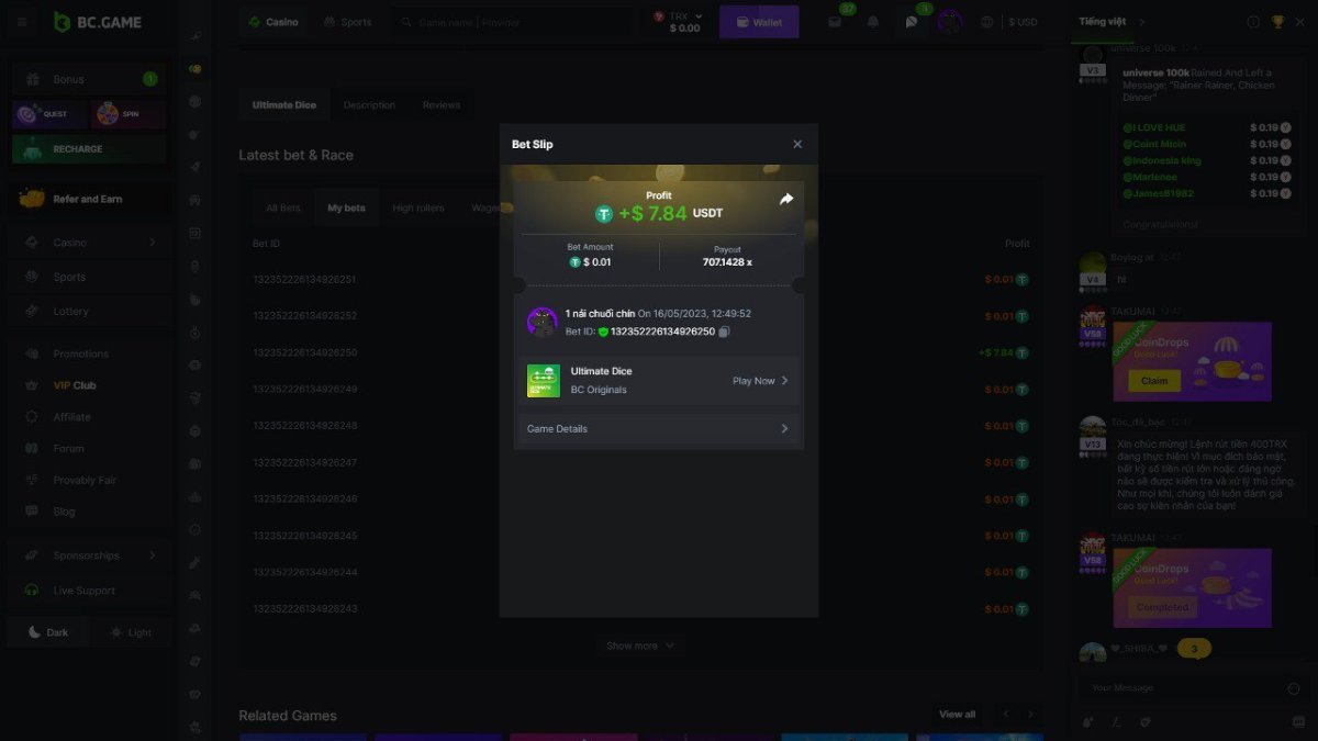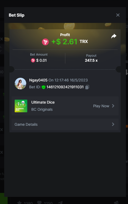 Maksypro Posted May 16, 2023 Share Posted May 16, 2023 Read Carefully Before Start To Hunt Daily Challenges #237 ULTIMATE DICE Hunt : Win the highest pay out Min Payout requirement 100x Min Level 4 ๏ธDuration Starting : Now End time : 23.59 UTC Time How to Join? Make screenshot + paste your bet link + UID or Profile link Any coin, with min bet 0.01 USD is allowed (jb/bb/bcl not allowed) Reward Prizes 1st Place.....$7 BCD 2nd Place.....$5 BCD 3rd Place.....$4 BCD 4th Place.....$3 BCD 5th Place.....$2 BCD ๐ต Winners will be announcing next day after Roll Point! 1 Link to comment Share on other sites More sharing options...