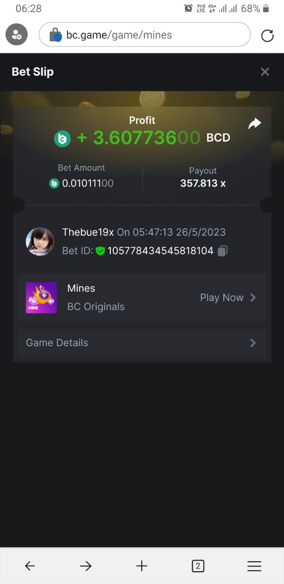 Maksypro Posted May 25, 2023 Share Posted May 25, 2023 Read Carefully Before Start To Hunt Daily Challenges #246 MINES Hunt : Win the highest multiplier Min Multiplier requirement 100x Min Level 4 ๏ธDuration Starting : Now End time : 23.59 UTC Time How to Join? Make screenshot + paste your bet link + UID or Profile link Any coin, with min bet 0.01 USD is allowed (jb/bb/bcl not allowed) Reward Prizes 1st Place.....$7 BCD 2nd Place.....$5 BCD 3rd Place.....$4 BCD 4th Place.....$3 BCD 5th Place.....$2 BCD ๐ต Winners will be announcing next day after Roll Point! 2 Link to comment Share on other sites More sharing options...