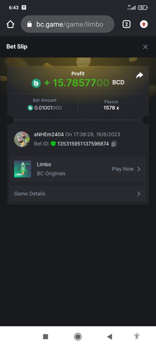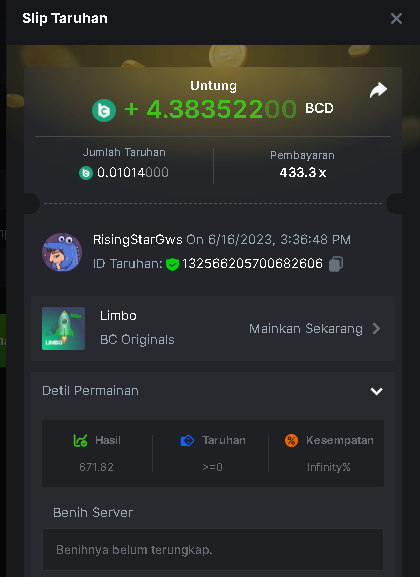 Maksypro Posted June 16, 2023 Share Posted June 16, 2023 Read Carefully Before Start To Hunt Daily Challenges #268 LIMBO Hunt : Win the highest multiplier Min Multiplier requirement 100x Min Level 4 ๏ธDuration Starting : Now End time : 23.59 UTC Time How to Join? Make screenshot + paste your bet link + UID or Profile link Any coin, with min bet 0.01 USD is allowed (jb/bb/bcl not allowed) Reward Prizes 1st Place.....$7 BCD 2nd Place.....$5 BCD 3rd Place.....$4 BCD 4th Place.....$3 BCD 5th Place.....$2 BCD ๐ต Winners will be announcing next day after Roll Point! 1 Link to comment Share on other sites More sharing options...