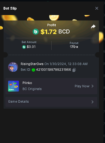 Moderator Giandreas Posted January 29, 2024 Moderator Share Posted January 29, 2024 Read Carefully Before Start To Hunt Forum Daily Challenges #494Hunt : Plinko Win the highest pay out Min Payout : x120 Min Level 10️Duration Starting : Now End time : 23.59 UTC Time How to Join? Make screenshot + paste your bet link + UID or Profile link Any coin, with min bet 0.01 USD is allowed (jb/bb/bcl not allowed)Reward Prizes 1st Place.....$7 BCD 2nd Place.....$5 BCD 3rd Place.....$4 BCD 4th Place.....$3 BCD 5th Place.....$2 BCD 🏵 Winners will be announcing next day after Roll Point! Link to comment Share on other sites More sharing options...