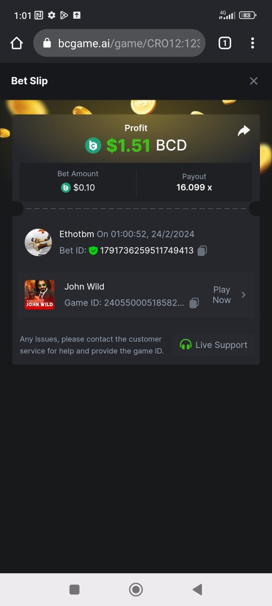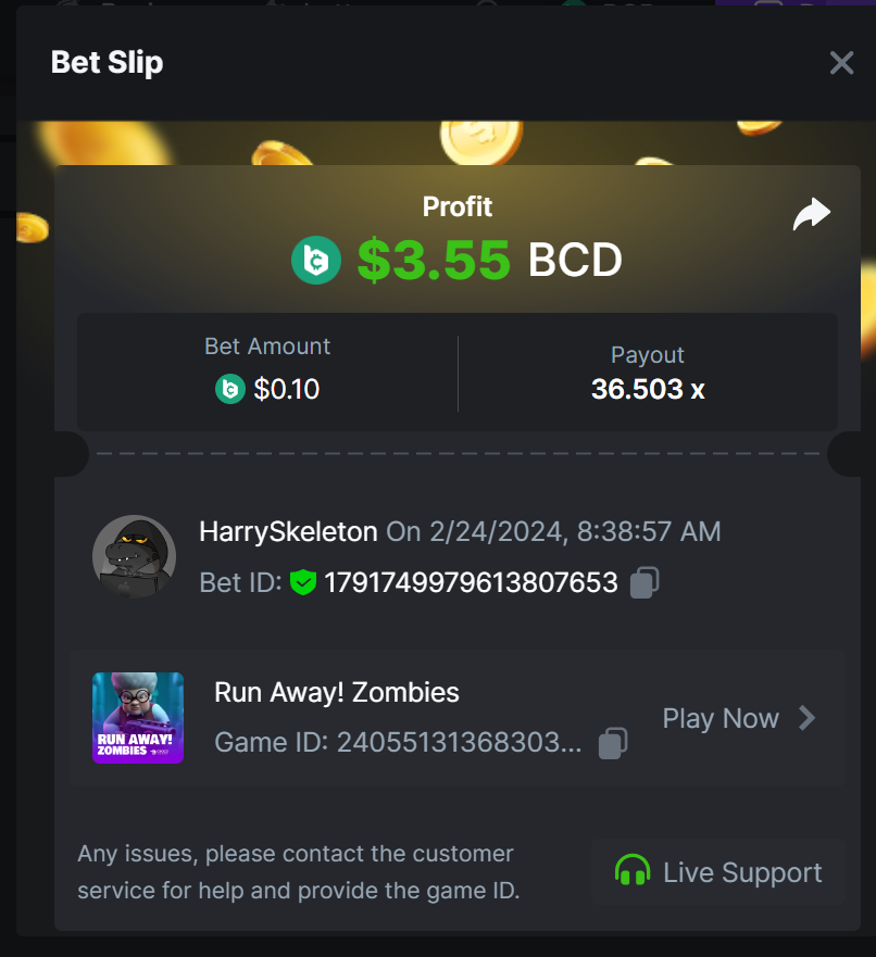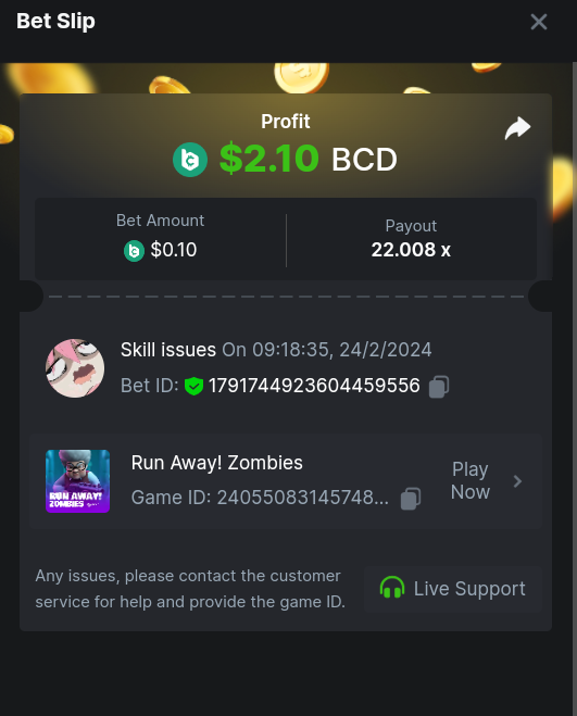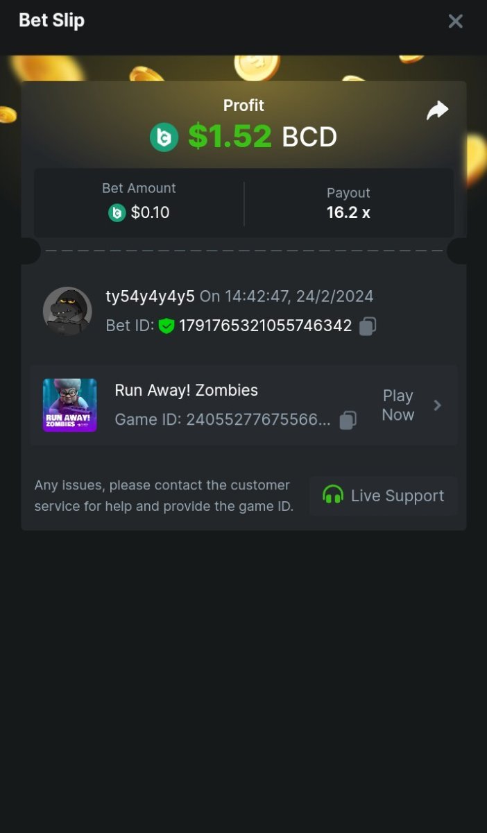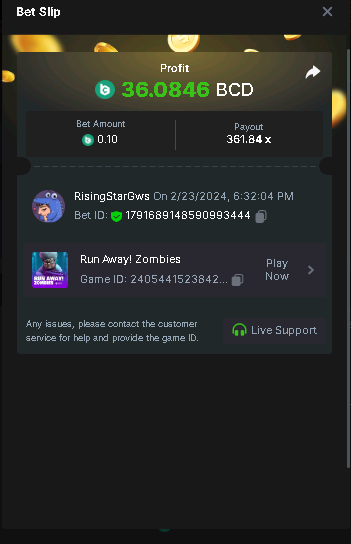 sloth Posted February 24, 2024 Share Posted February 24, 2024 Wizard`s Academy - 470.287x https://bc.game/#/sd/11TA6BMYKQZBNZ Deadliest Sea - 244.1748X https://bc.game/#/sd/11TA2PER3KQ1EB Dragon Quest - 240.1733x https://bc.game/#/sd/11TA3E2NJCAHZN 1 Link to comment Share on other sites More sharing options...
