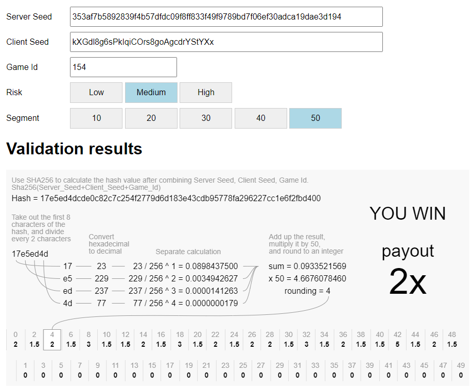 真是的 Posted August 21, 2020 Share Posted August 21, 2020 Here is the verification tool for HILO games https://alpha-one-two.github.io/BC-Game-HILO/ I have tried to show the calculation process completely Go to the website and paste your Server-Seed, Client-Seed and Nonce into the field, and then verify it. Link to comment Share on other sites More sharing options...
