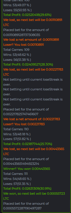 drliner187 Posted April 20, 2023 Share Posted April 20, 2023 On 12/9/2021 at 4:19 AM, Skele said: kind of lack luster. I have several scripts but one of main things i did was add better logging I also added a feature that after two losses in a row, it will pause until it sees at least 1 win. You sometimes miss a win on the 3rd game true. But i no longer have to deal with 13 game losing streaks. It will take two and then just wait it out for green pastures. I need to change my script back to straight amounts for better, currently i use a percentage of my bank roll for the bet and then this one is the typical double it on loss. I will post it in its own message var config = { betPercentage: { label: 'percentage of total coins to bet', value: 0.25, type: 'number' }, payout: { label: 'payout', value: 2, type: 'number' }, onLoseTitle: { label: 'On Lose', type: 'title' }, onLoss: { label: '', value: 'increase', type: 'radio', options: [{ value: 'reset', label: 'Return to base bet' }, { value: 'increase', label: 'Increase bet by (loss multiplier)' } ] }, lossMultiplier: { label: 'loss multiplier', value: 2, type: 'number' }, onWinTitle: { label: 'On Win', type: 'title' }, onWin: { label: '', value: 'reset', type: 'radio', options: [{ value: 'reset', label: 'Return to base bet' }, { value: 'increase', label: 'Increase bet by (win multiplier)' } ] }, winMultiplier: { label: 'win multiplier', value: 1, type: 'number' }, otherConditionsTitle: { label: 'Other Stopping Conditions', type: 'title' }, winGoalAmount: { label: 'Stop once you have made this much', value: currency.amount * 2, type: 'number' }, lossStopAmount: { label: 'Stop betting after losing this much without a win.', value: 0, type: 'number' }, otherConditionsTitle: { label: 'Experimentle Please Ignore', type: 'title' }, loggingLevel: { label: 'logging level', value: 'compact', type: 'radio', options: [{ value: 'info', label: 'info' }, { value: 'compact', label: 'compact' }, { value: 'verbose', label: 'verbose' } ] } }; // deleted input parameters var stop = 0; var lossesForBreak = 0; var roundsToBreakFor = 0; // end deleted parameters var totalWagers = 0; var netProfit = 0; var totalWins = 0; var totalLoses = 0; var longestWinStreak = 0; var longestLoseStreak = 0; var currentStreak = 0; var loseStreak = 0; var numberOfRoundsToSkip = 0; var currentBet = GetNewBaseBet(); var totalNumberOfGames = 0; var originalbalance = currency.amount; var runningbalance = currency.amount; var consequetiveLostBets = 0; var lossStopAmountVar = config.lossStopAmount.value; function main() { game.onBet = function () { // if we are set to skip rounds then do so. if (numberOfRoundsToSkip > 0) { numberOfRoundsToSkip -= 1; log.info('Skipping round to relax, and the next ' + numberOfRoundsToSkip + ' rounds.'); return; } else { if(totalNumberOfGames == 0) { // this is so we account for the first round. currentBet = GetNewBaseBet(); } if(loseStreak >= 2) { if(game.history[0].crash > 200) { loseStreak = 0; } else { log.info('Not betting until current loseStreak is over.'); return; } } log.info('Placed bet for the amount of ' + currentBet); game.bet(currentBet, config.payout.value).then(function (payout) { runningbalance -= currentBet; totalWagers += currentBet; totalNumberOfGames += 1; if (payout > 1) { var netwin = currentBet * config.payout.value - currentBet; consequetiveLostBets = 0; if(config.loggingLevel.value != 'compact') { LogMessage('We won a net profit of: ' + netwin.toFixed(8), 'success'); } netProfit += netwin; runningbalance += netwin + currentBet; if (loseStreak > 0) { loseStreak = 0; } currentStreak += 1; totalWins += 1; LogSummary('true', currentBet); if (config.onWin.value === 'reset') { currentBet = GetNewBaseBet(); } else { currentBet *= config.winMultiplier.value; } LogMessage('We won, so next bet will be ' + currentBet.toFixed(8) + ' ' + currency.currencyName, 'success'); } else { log.error('We lost a net amount of: ' + currentBet.toFixed(8)); netProfit -= currentBet; loseStreak += 1; currentStreak = 0; totalLoses += 1; consequetiveLostBets += currentBet; LogSummary('false', currentBet); if (config.onLoss.value == 'reset') { currentBet = GetNewBaseBet(); } else { currentBet *= config.lossMultiplier.value; } LogMessage('We lost, so next bet will be ' + currentBet.toFixed(8) + ' ' + currency.currencyName, 'failure'); } if (currentStreak > longestWinStreak) { longestWinStreak = currentStreak; } if (loseStreak > longestLoseStreak) { longestLoseStreak = loseStreak; } recordStats(); if (config.winGoalAmount.value != 0 && netProfit > config.winGoalAmount.value) { // we have earned enough stop and quit. log.success('The net profits ' + netProfit.toFixed(8) + ' which triggers stop the for making enough.'); game.stop(); } if (lossStopAmountVar != 0 && consequetiveLostBets > (lossStopAmountVar)) { // the point of this is to limit the bleed so you don't loose too much. log.error('The net profits ' + netProfit.toFixed(8) + ' which triggers stop for losing enough. The next bet would be ' + currentBet.toFixed(8) + '.'); game.stop(); } } ); } }; } function recordStats() { if (config.loggingLevel.value != 'compact') { LogMessage('total wagers: ' + totalWagers.toFixed(8), 'info'); LogMessage('Net Profit: ' + netProfit.toFixed(8), 'info'); LogMessage('Current win streak: ' + currentStreak, 'info'); LogMessage('Current Lose streak: ' + loseStreak, 'info'); LogMessage('Total wins: ' + totalWins, 'info'); LogMessage('Total Losses: ' + totalLoses, 'info'); LogMessage('Longest win streak: ' + longestWinStreak, 'info'); LogMessage('Longest lose streak: ' + longestLoseStreak, 'info'); } } function GetNewBaseBet() { var returnValue = 0; returnValue = runningbalance * (config.betPercentage.value / 100); if(returnValue > currency.minAmount) { LogMessage('Recalculating base bet to ' + returnValue.toFixed(8) + ' which is ' + config.betPercentage.value + ' percent of ' + runningbalance.toFixed(8), 'info'); } else { LogMessage('The recalculated bet amount ' + returnValue.toF