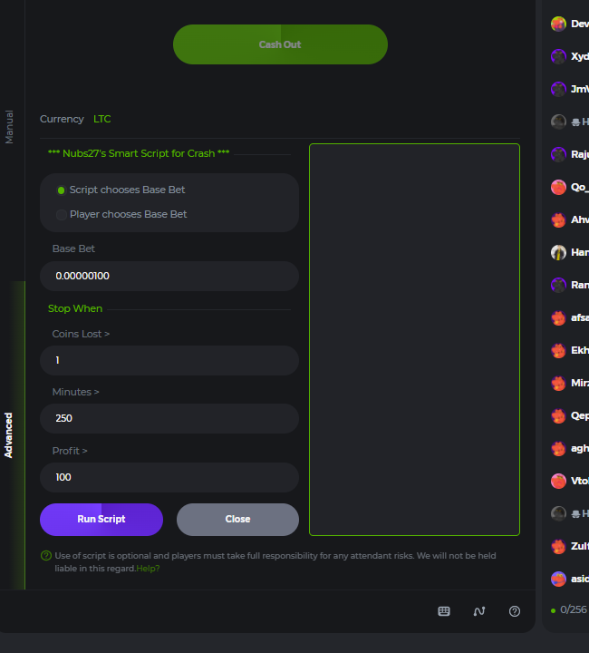 Moh6 Posted October 26, 2024 Share Posted October 26, 2024 On 12/10/2021 at 8:11 AM, Skele said: Yes you can easily export the data as a CSV normally. Unfortunately here they seem to be running the script as a web worker and so it doesn't have access to the DOM since only 1 thread has access to the dom. If i spent enough time digging into it i may be able to figure out how to register my own worker or what messages it is listening for and try to intercept it on the way back out. But to be honest I would probably just write the data out to the log window in a csv type of format, then use a browser extension like "Code Injector" to read and parse the html to return a csv that way. Here is the basic code from returning a CSV that most people use. Note that with Code Injector you can inject your own button that you can click manually so you won't need the hack to create and then click a hidden hyper link. Here is my test script which works up until it trys to return the csv then it complains because the javascript doesn't have access to the DOM on this thread. var config = {} var arrayHeader = ["Date", "Cashed At", "Crash", "GameId", "Hash", "Odds", "Wager"]; var arrayData = []; arrayData.push(arrayHeader); function main () { console.log(engine); let gameCount = 0; console.log(game); game.onBet = function () { console.log('starting game'); console.log(game.history); log.info('Last game information') log.info('cashedat: ' + game.history[0].cashedat) log.info('crash:' + game.history[0].crash) log.info('gameid: ' + game.history[0].gameId) log.info('hash: ' + game.history[0].hash) log.info('odds: ' + game.history[0].odds) log.info('wager: ' + game.history[0].wager) console.log(game.history[0]); LogForCSV(game.history[0].cashedat, game.history[0].crash, game.history[0].gameId, game.history[0].hash, game.history[0].odds, game.history[0].wager); gameCount++; console.log(gameCount); if(gameCount % 5 == 0) { ExportToCsv(); //Reset the data so you don't get duplicates arrayData = arrayHeader; } let today = new Date(); let fileName = 'CrashResults_' + today.month + '.' + today.day + '.' + today.year + ".csv"; ExportToCsv(arrayHeader, arrayData, ',', fileName); } } function ExportToCsv(){ let csv = ''; arrayData.forEach( array => { csv += array.join(',') + "\n"; }); let csvUrl = 'data:text/csv;charset=utf-8,' + encodeURI(csv); let hiddenElement = document.createElement('a'); hiddenElement.href = csvUrl; hiddenElement.target = '_blank'; hiddenElement.download = fileName + '.csv'; hiddenElement.click(); } function LogForCSV(cashedAt, crash, gameid, hash, odds, wager) { let current_datetime = new Date(); let formatted_date = current_datetime.getFullYear() + "-" + (current_datetime.getMonth() + 1) + "-" + current_datetime.getDate() + " " + current_datetime.getHours() + ":" + current_datetime.getMinutes() + ":" + current_datetime.getSeconds(); let entry = [formatted_date, cashedAt, crash, gameid, hash, odds, wager]; arrayData.push(entry); } so what you can do is just change the ExportToCsv to return the CSV string. Then with CodeInjector you can have it create and return the CSV, either by looking for known markers that start the data like ~~~ or whatever, or you can just take the entire contents of the div return it as a csv and then clear the window which is probably the best option so that way every time you export you only get new stuff. The history object only contains like the last 20 games i believe so it isn't really good for long term history they tell you to store your own. Let me know if you get Code Injector for your browser and i will write you something to look for messages and then pull the data into there actually for export. Message me actually to set that up. after the loosing it is always like this "Not betting until current loseStreak is over." and it never bes again even if the next game was green how to fix it? On 12/9/2021 at 6:19 AM, Skele said: kind of lack luster. I have several scripts but one of main things i did was add better logging I also added a feature that after two losses in a row, it will pause until it sees at least 1 win. You sometimes miss a win on the 3rd game true. But i no longer have to deal with 13 game losing streaks. It will take two and then just wait it out for green pastures. I need to change my script back to straight amounts for better, currently i use a percentage of my bank roll for the bet and then this one is the typical double it on loss. I will post it in its own message var config = { betPercentage: { label: 'percentage of total coins to bet', value: 0.25, type: 'number' }, payout: { label: 'payout', value: 2, type: 'number' }, onLoseTitle: { label: 'On Lose', type: 'title' }, onLoss: { label: '', value: 'increase', type: 'radio', options: [{ value: 'reset', label: 'Return to base bet' }, { value: 'increase', label: 'Increase bet by (loss multiplier)' } ] }, lossMultiplier: { label: 'loss multiplier', value: 2, type: 'number' }, onWinTitle: { label: 'On Win', type: 'title' }, onWin: { label: '', value: 'reset', type: 'radio', options: [{ value: 'reset', label: 'Return to base bet' }, { value: 'increase', label: 'Increase bet by (win multiplier)' } ] }, winMultiplier: { label: 'win multiplier', value: 1, type: 'number' }, otherConditionsTitle: { label: 'Other Stopping Conditions', type: 'title' }, winGoalAmount: { label: 'Stop once you have made this much', value: currency.amount * 2, type: 'number' }, lossStopAmount: { label: 'Stop betting after losing this much without a win.', value: 0, type: 'number' }, otherConditionsTitle: { label: 'Experimentle Please Ignore', type: 'title' }, loggingLevel: { label: 'logging level', value: 'compact', type: 'radio', options: [{ value: 'info', label: 'info' }, { value: 'compact', label: 'compact' }, { value: 'verbose', label: 'verbose' } ] } }; // deleted input parameters var stop = 0; var lossesForBreak = 0; var roundsToBreakFor = 0; // end deleted parameters var totalWagers = 0; var netProfit = 0; var totalWins