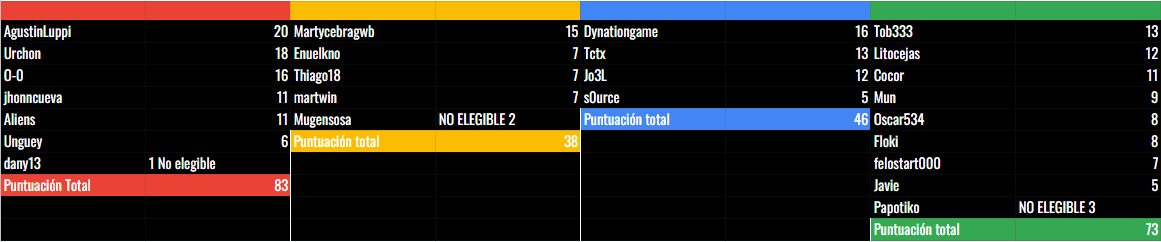 s0urce Posted June 11, 2022 Author Share Posted June 11, 2022 Mil disculpas, olvidé por completo publicar la lista de ganadores aquí, solo la publiqué en el chat Los premios ya fueron enviados hace 2 días: A los 4 mejores jugadores de cada equipo, y a todos los jugadores elegibles de los 2 equipos ganadores. Link to comment Share on other sites More sharing options...
